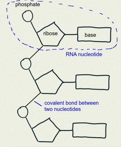 Draw a simple diagram showing the structure of a short piece of RNA made of three nucleotides [4]