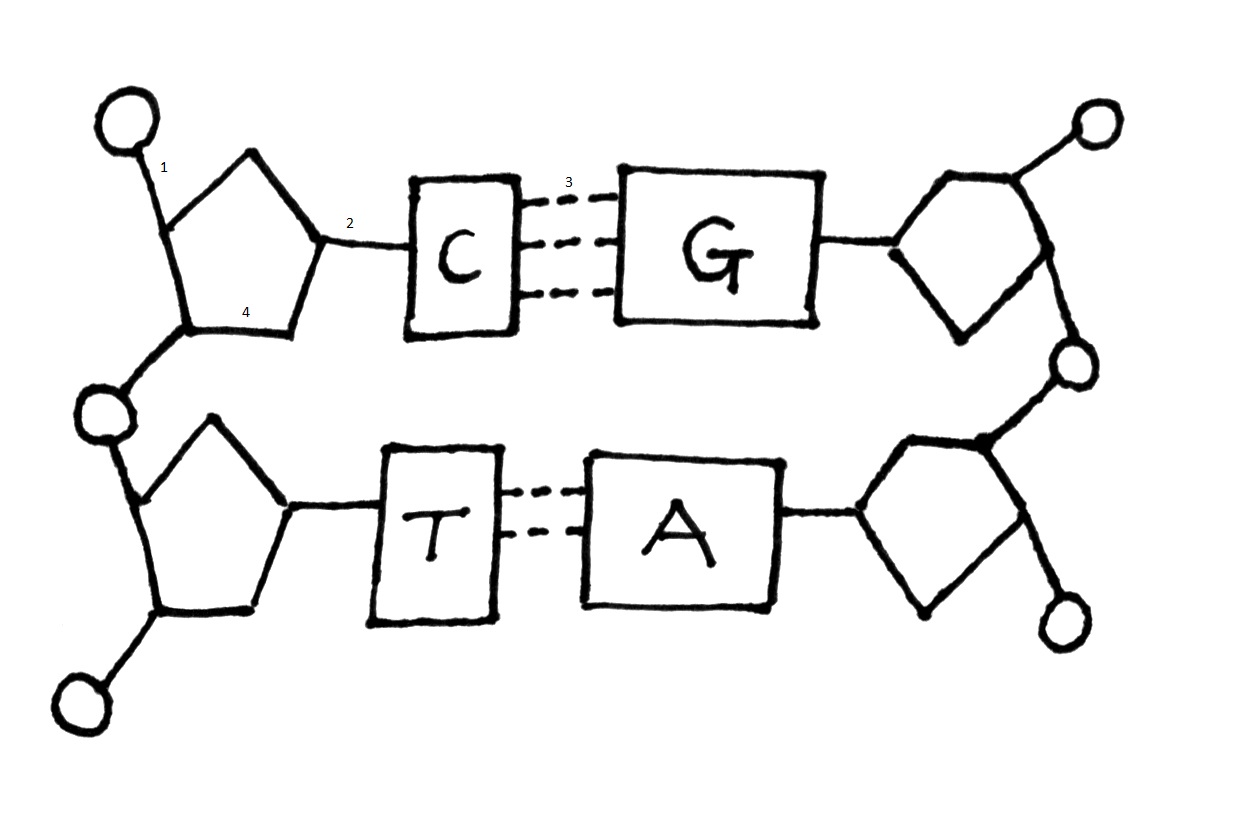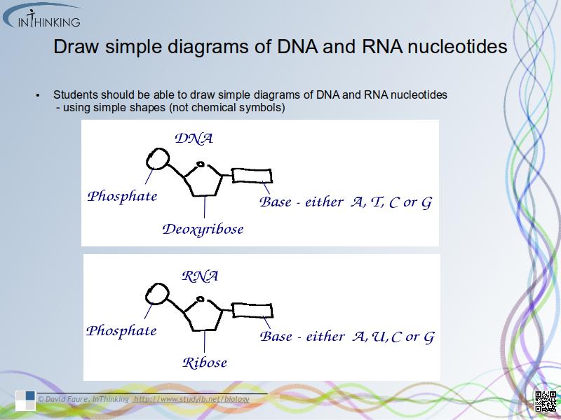- Students should be able to draw simple diagrams of DNA and RNA nucleotides - using simple shapes (not chemical symbols). Two antiparallel strands of DNA showing base pairing. A 'ladder' structure is enough.