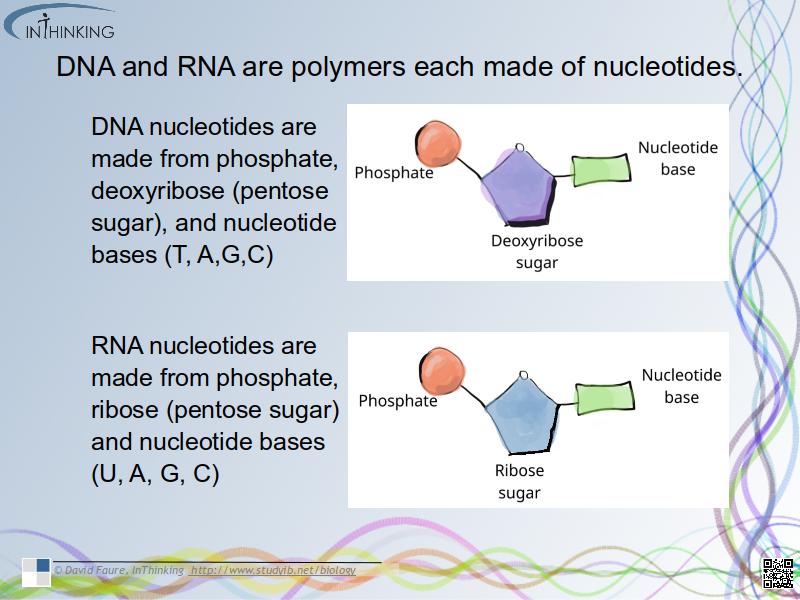 - A DNA nucleotide is made from phosphate, deoxyribose (pentose sugar), and nucleotide bases (T, A,G,C)