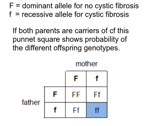 Explain how parents who do not have the recessive phenotype for cystic fibrosis can produce a child with the recessive phenotype. [4]