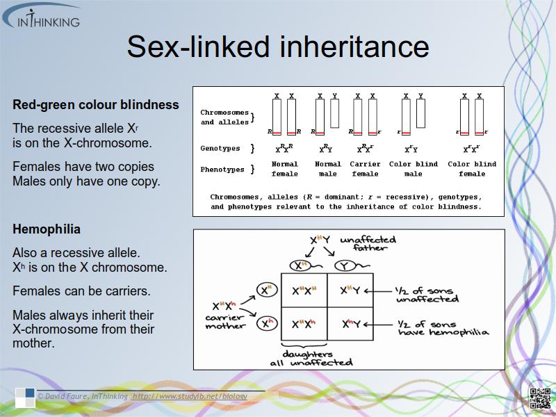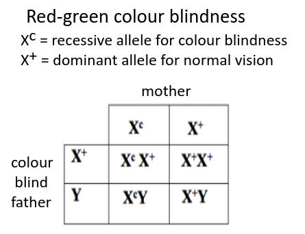 - Explain inheritance of red-green colour blindness and hemophilia as examples of sex-linked inheritance.