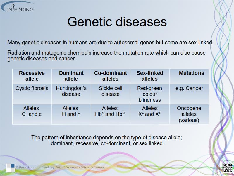- Many genetic diseases in humans are due to recessive, dominant or co-dominant alleles of autosomal genes.