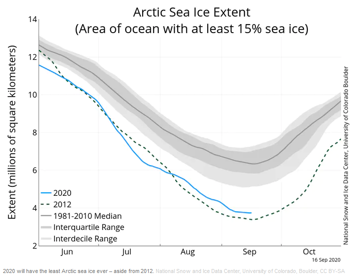 Compare and contrast the extent of sea ice between the 1981-2010 median, 2012 and 2020. [4]