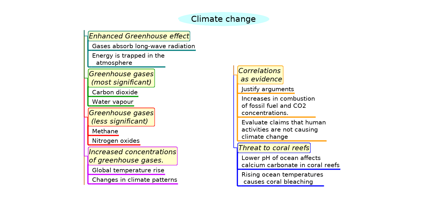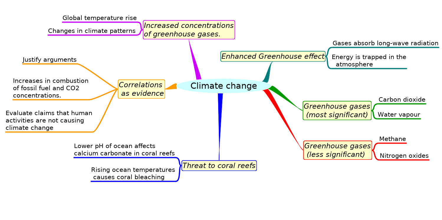 Greenhouse gases in the atmosphere, including water vapour, carbon dioxide, methane, and nitrogen oxide, absorb heat energy, keeping Earth’s surface and lower atmosphere warm. Through increased burning of fossil fuels humans are adding more greenhouse gases to the atmosphere, enhancing the greenhouse effect, making the Earth’s atmosphere warmer, changing the climate and damaging marine life like coral. This topic covers the basics of climate change.Learn and test your biological vocabulary for 4.4 Climate change using these flashcards