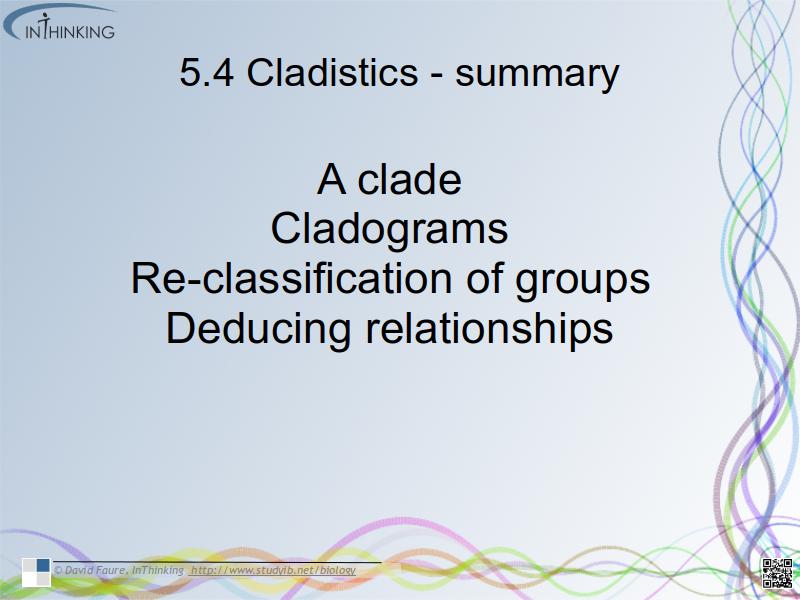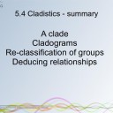 Cladistics is the study of the family relationships between different classification groups. A clade is a group containing all the descendants of an ancestor species. A variety of evidence is used to build cladograms and this topic looks at this data and some of the difficulties of interpretation.These slides summarise the essential understanding and skills in this topic.