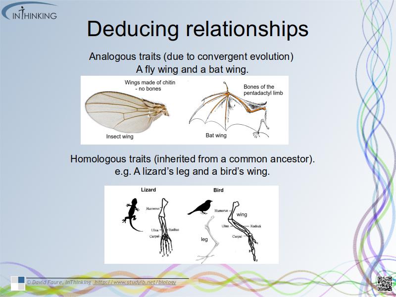 - Traits can be analogous (due to convergent evolution) or homologous (inherited from a common ancestor).