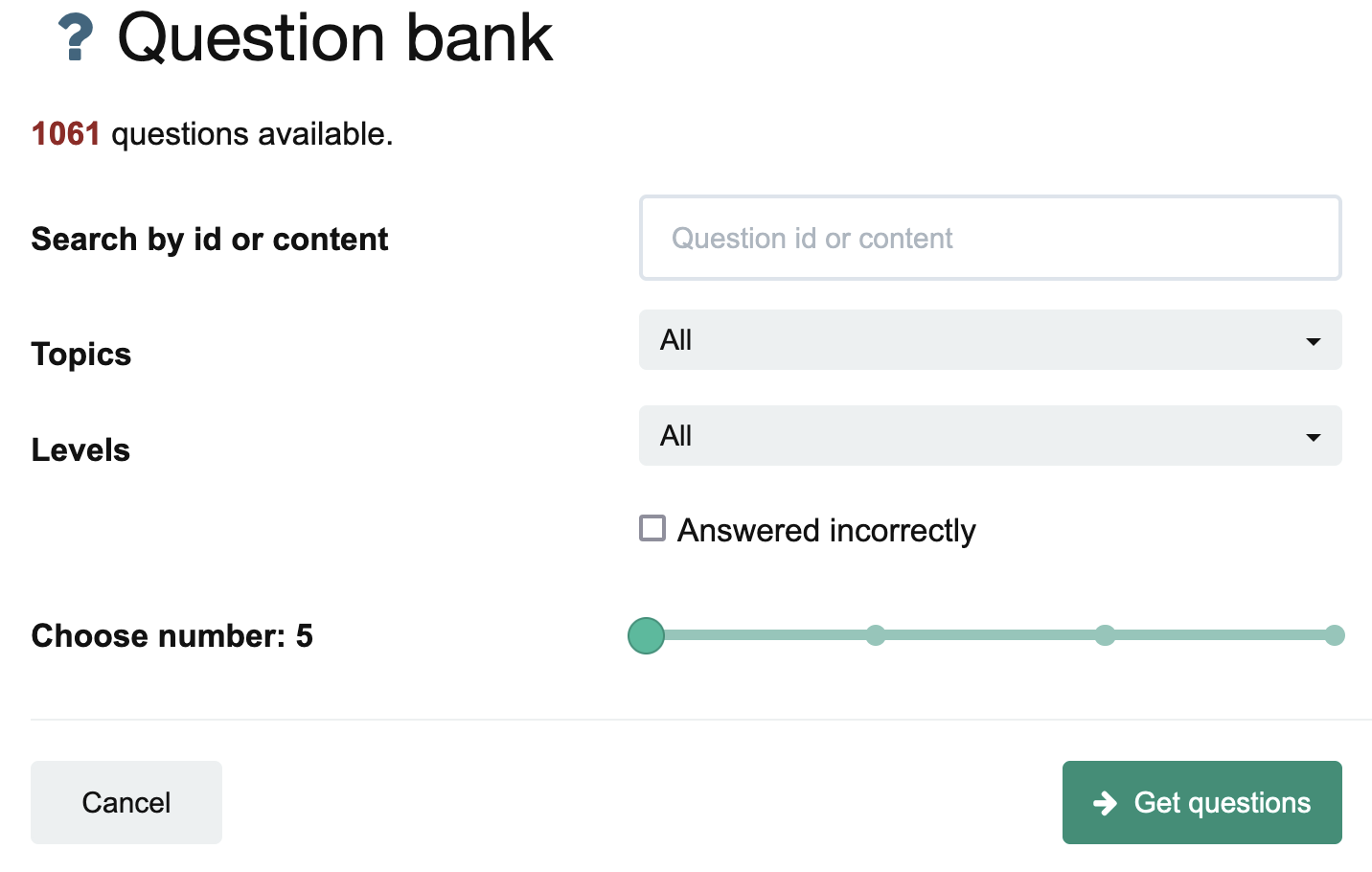 The Answered incorrectly tick box allows you to return to questions that you have attempted previously using the Question bank quiz generator and got wrong - a useful tool as you work your way through all the topics in preparation for the exams.