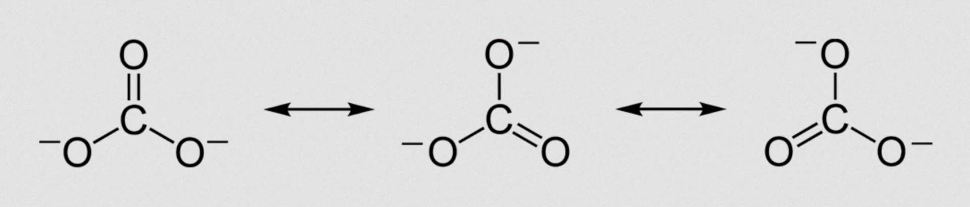 Resonance structures involve shifting around double bonds to different positions in a molecule. For example, the carbonate ion CO32– is said to exhibit resonance, because the shape of the compound ion with three C–O bonds of equal length cannot be represented by a conventional Lewis diagram. The resonance structures are shown below (showing bonds only for clarity; lone pairs are not shown):