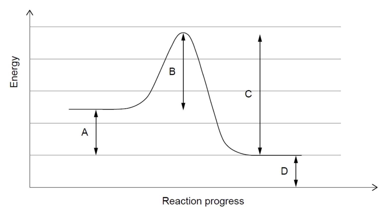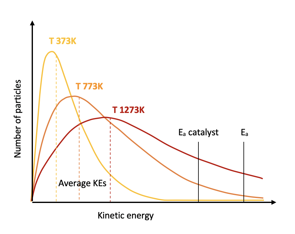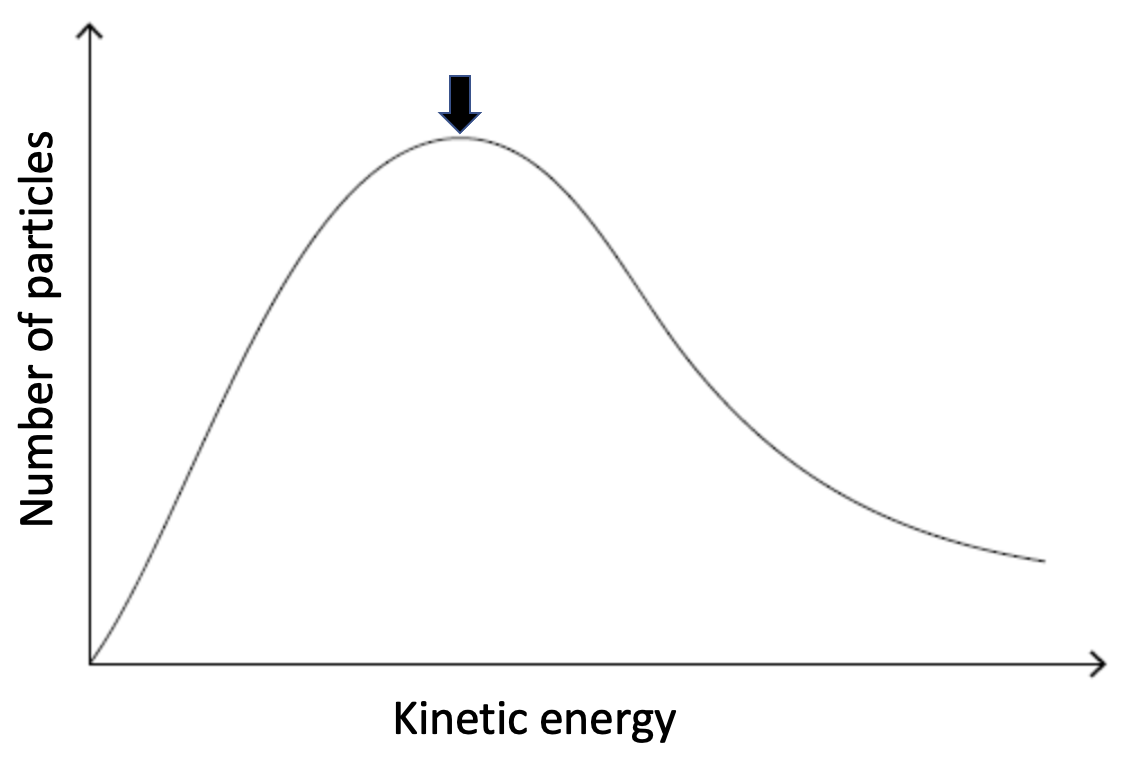 The diagram below represents a Maxwell-Boltzmann energy distribution of a gas at a temperature, T.