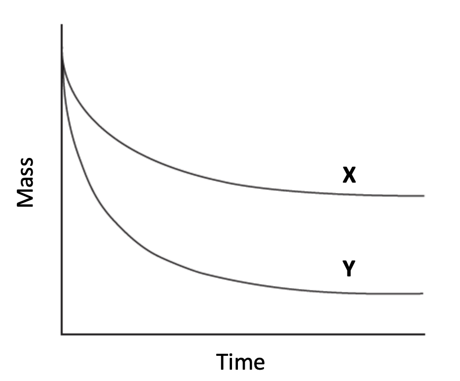 Excess magnesium ribbon was added to hydrochloric acid, and the mass of the reaction vessel was monitored over time to give line X.
