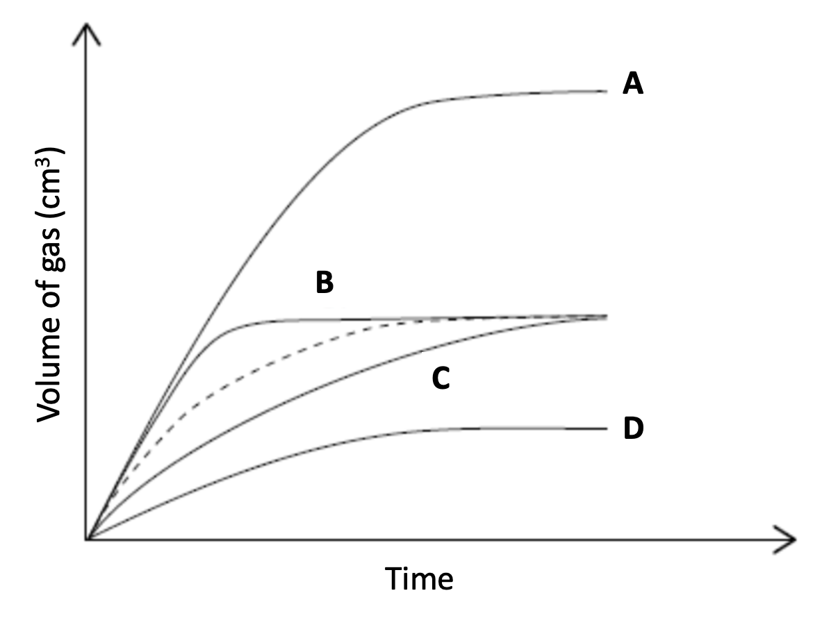 The dotted line represents the volume of hydrogen gas evolved over time when excess magnesium ribbon is added to hydrochloric acid.