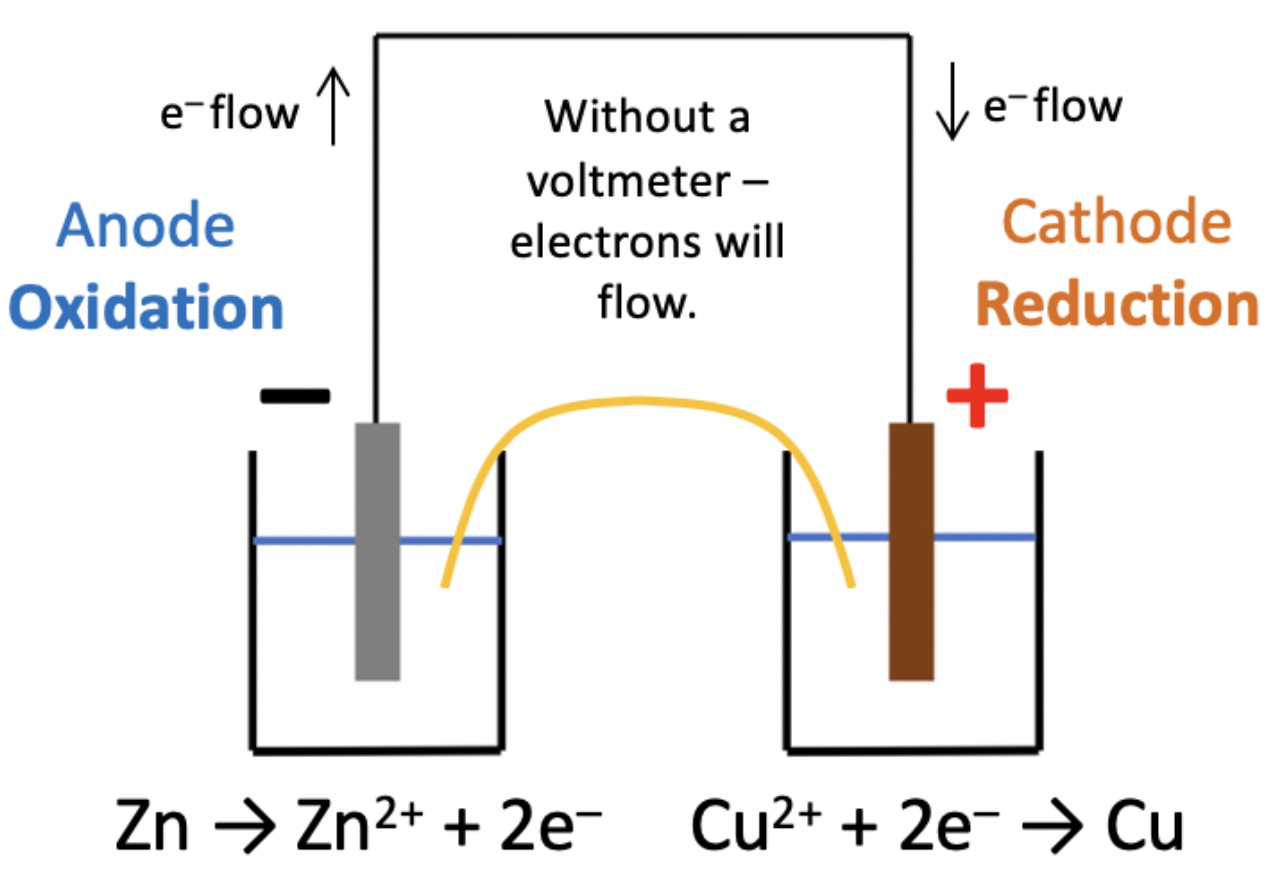 In a voltaic cell the redox reaction causes the electrodes to become charged and this generates electron flow from negative electrode (anode) to positive electrode (cathode).