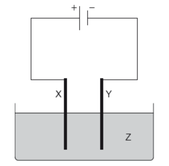 Therefore the object needs to be placed as the cathode (Y) as nickel is deposited on the cathode, and the anode (X) needs to be nickel, as nickel is lost from the anode (instead of oxygen being produced). The solution needs to be a nickel salt solution, in this case NiSO4(aq).