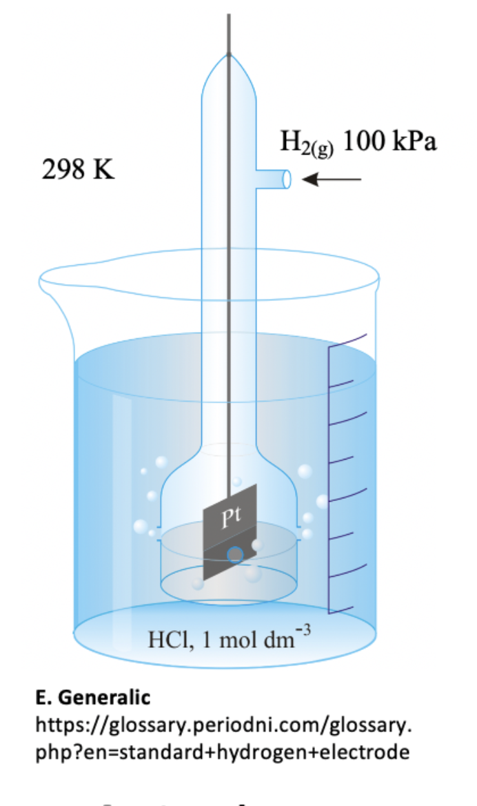 The standard hydrogen electrode consists of a feed of hydrogen gas at 100 kPa onto an inert Pt electrode in 1 mol dm–3 hydrochloric acid all at 298 K.
