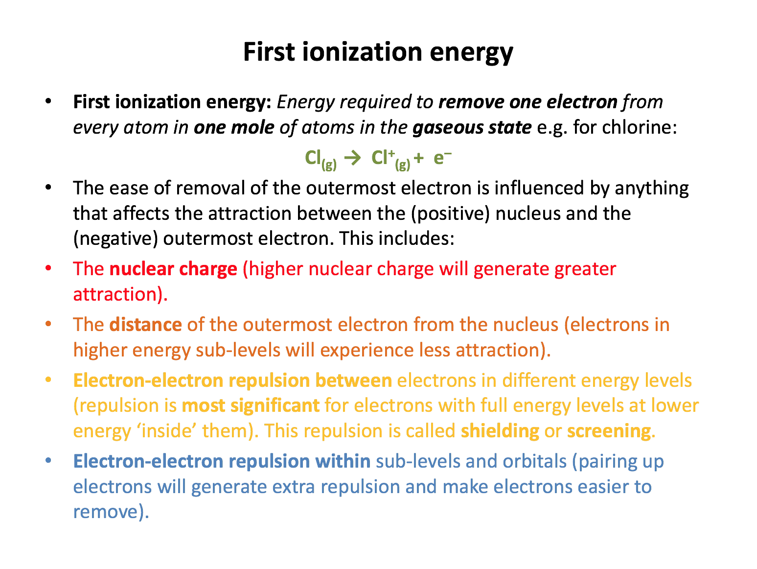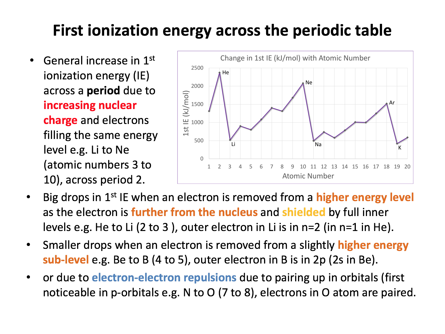 Ensure that you can sketch the first ionisation energy graph shown on revision card 3, and practise explaining it (to yourself or even better to someone else who also needs to learn it - take it in turns). In time it will stick, and from the understanding of this graph, you will be able to 'extrapolate' your knowledge to other problems/data.