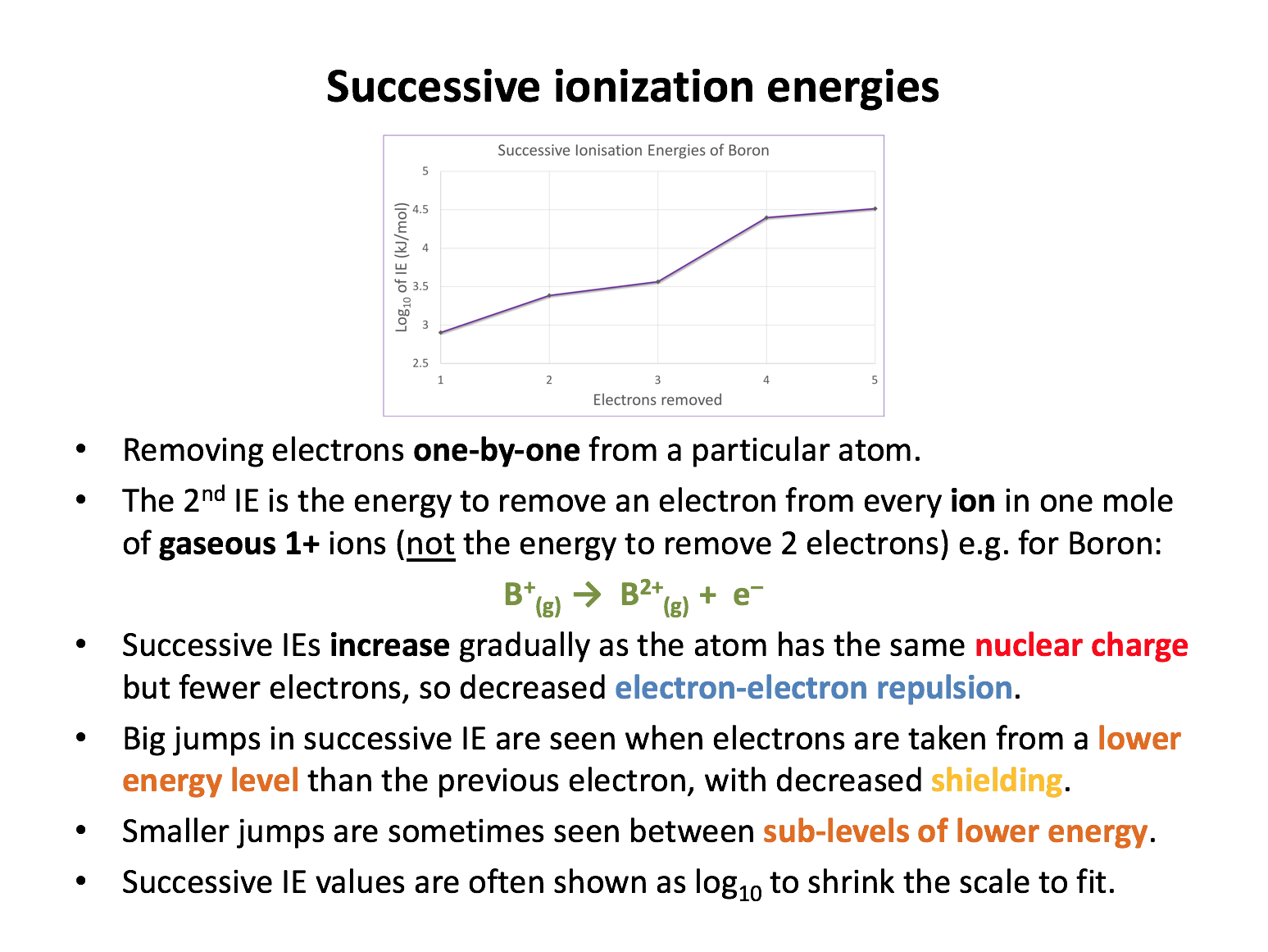 3 The electron removed has greater 'shielding' (repulsion) by complete inner energy levels of electrons