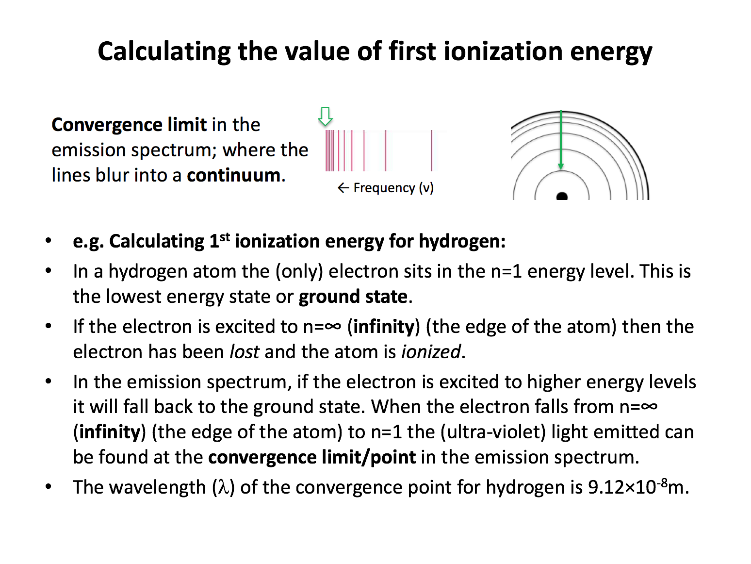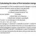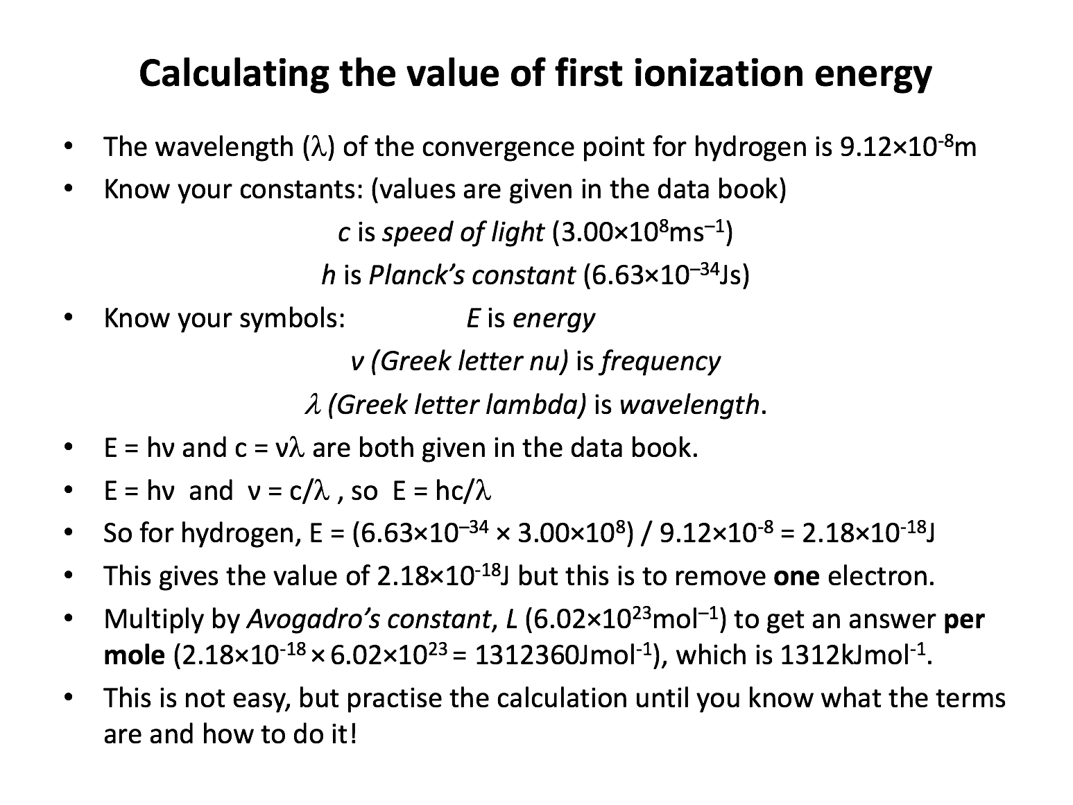The calculation of the first ionisation energy of hydrogen is particularly tough to get your head around. Using revision card 6 as your model, practise writing out the calculation repeatedly, and explaining it as you go. When you know it 'by wrote', you will also be able to more easily apply your knowledge to slight variations on the problem.
