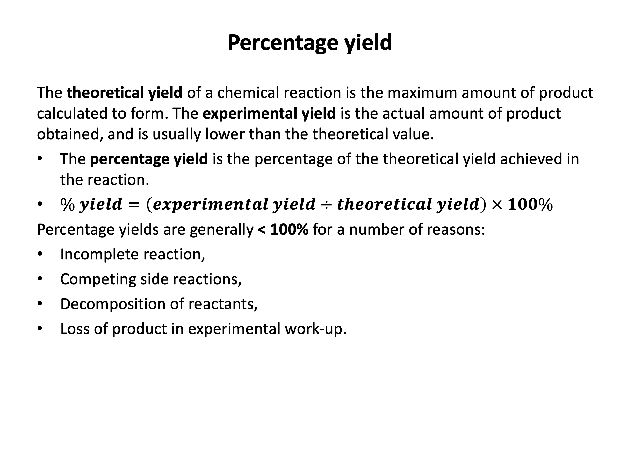 percentage yield = (experimental yield / theorectical yield) × 100%