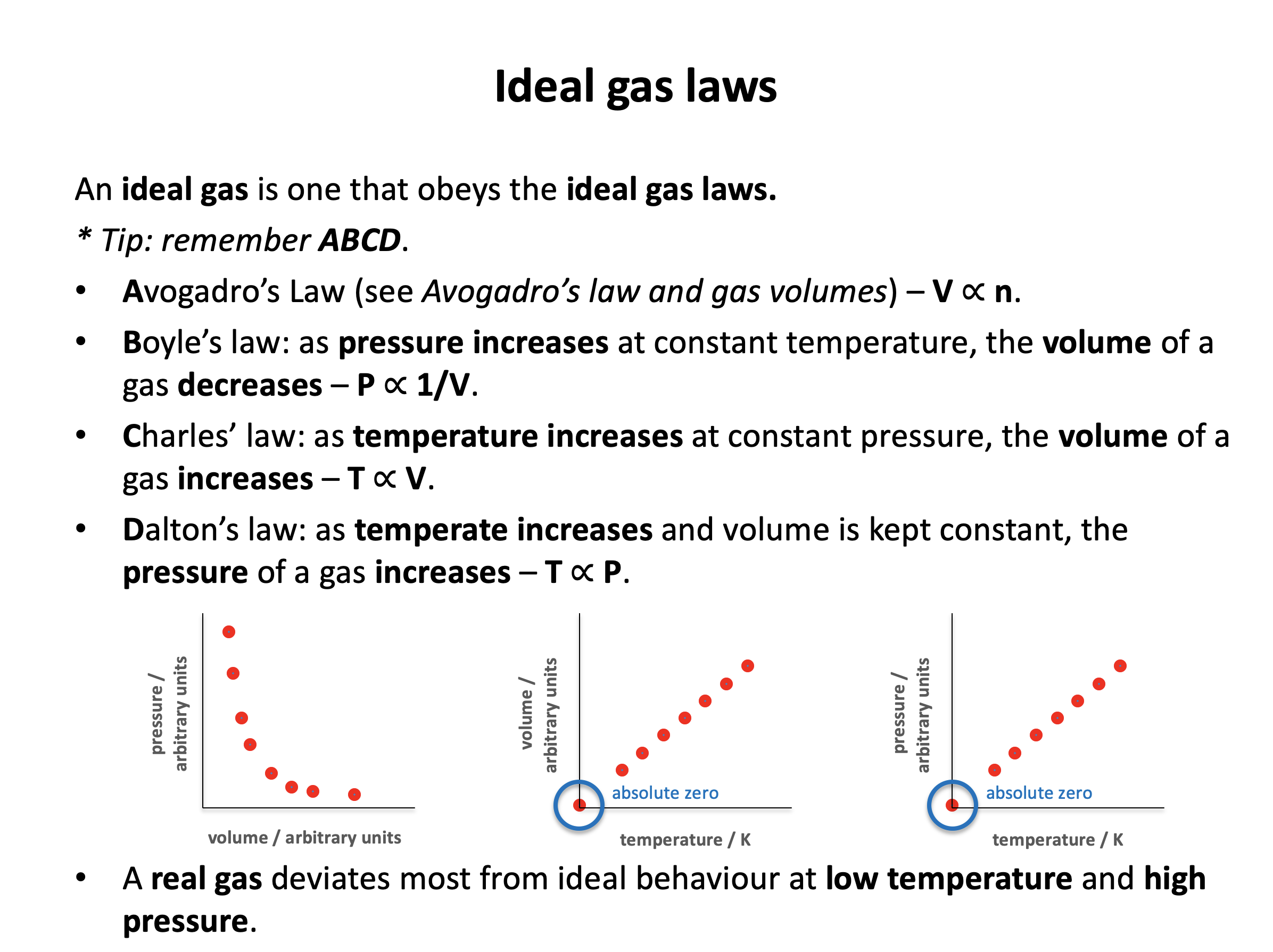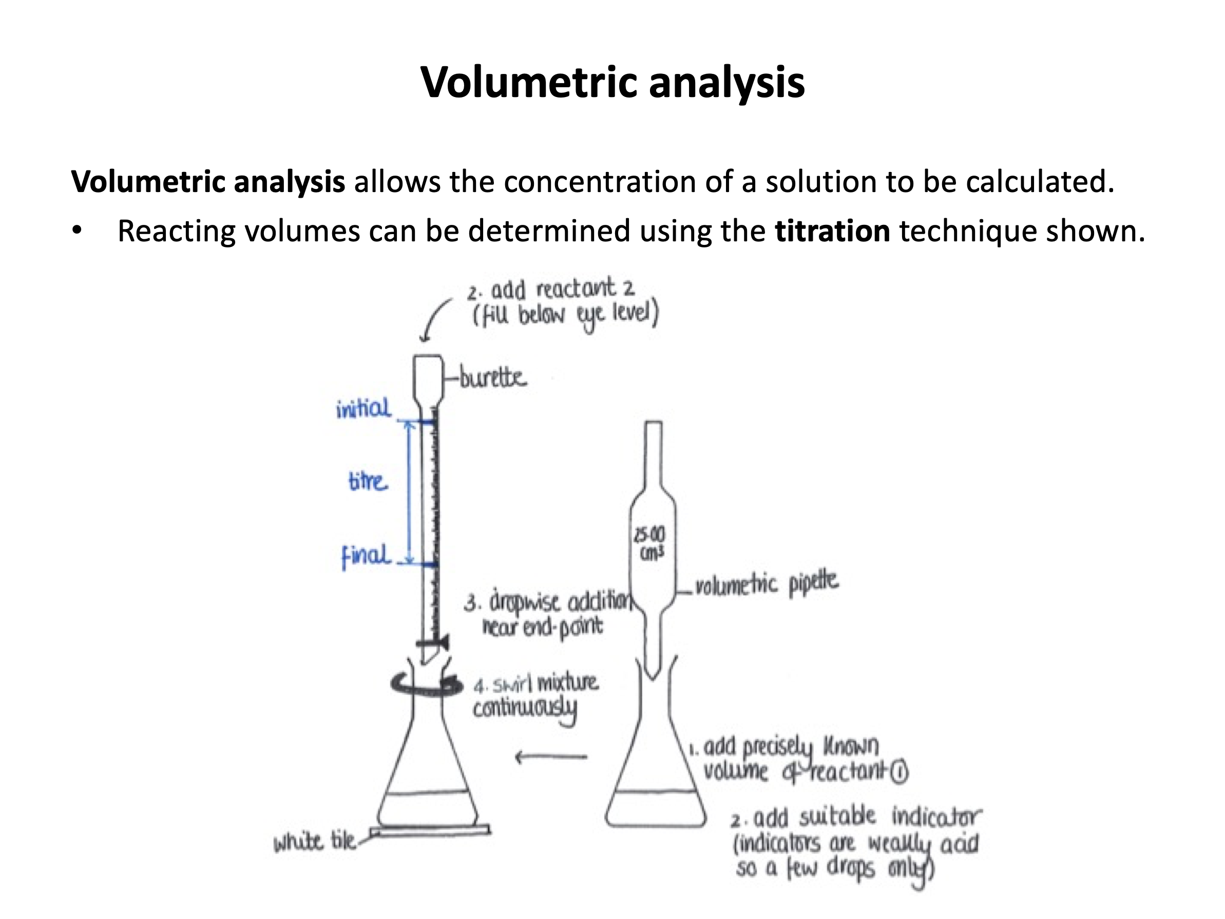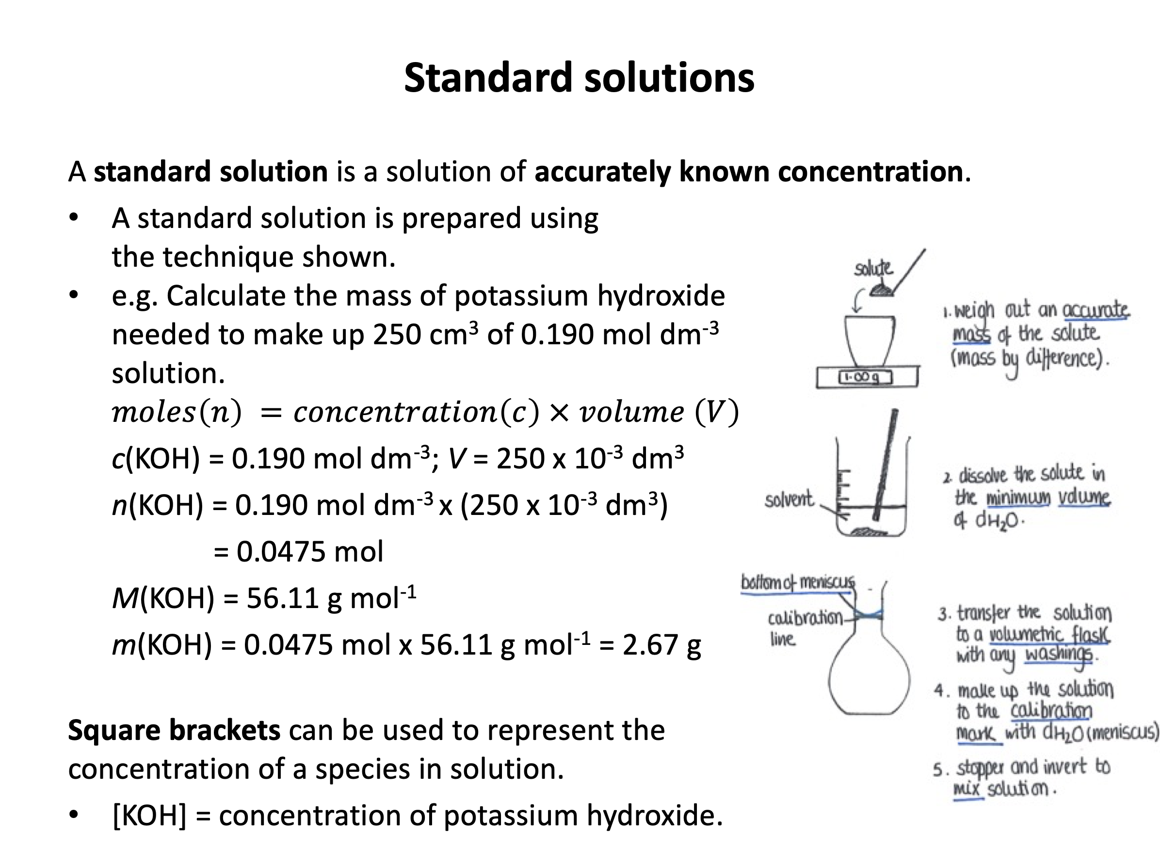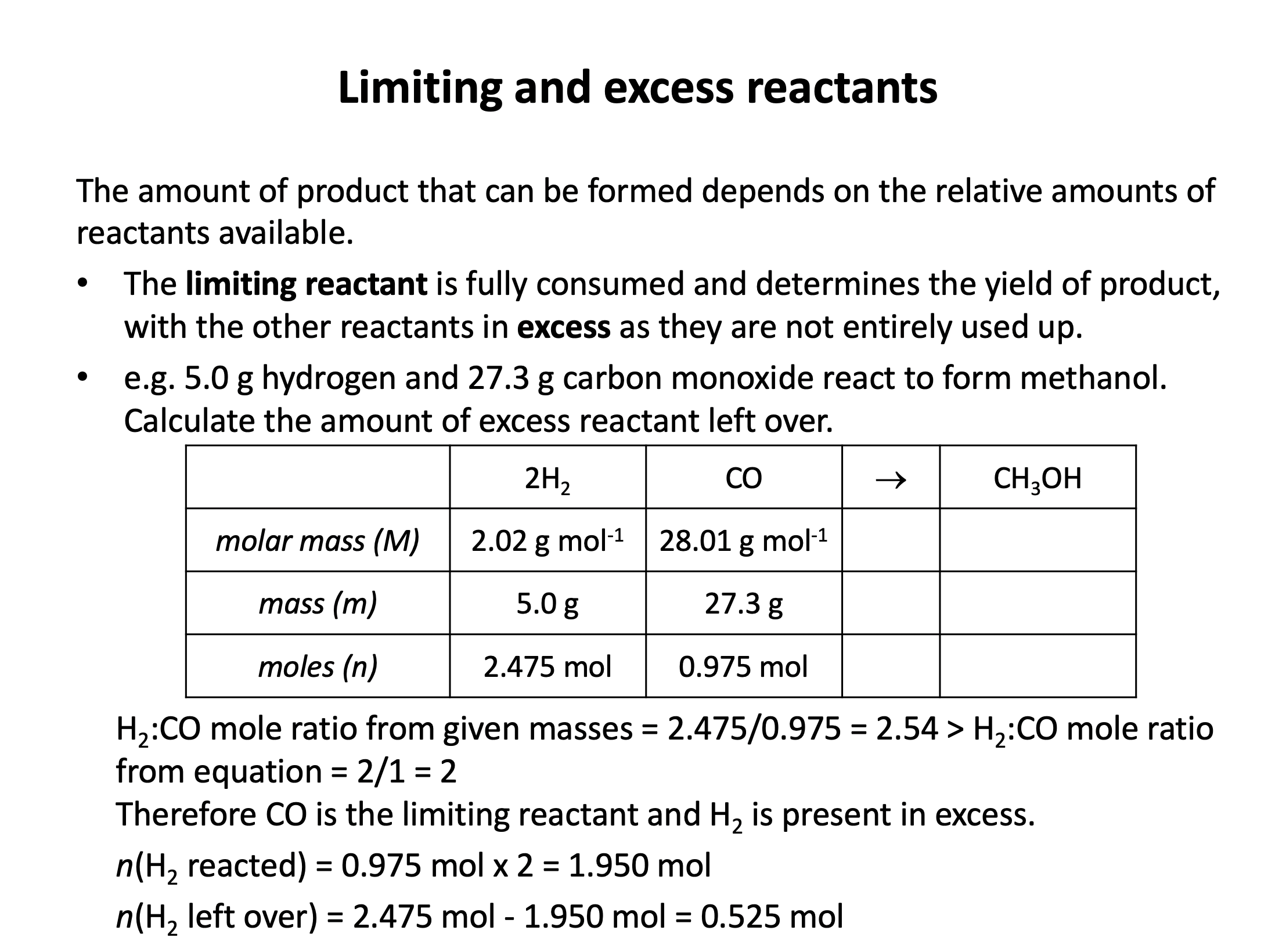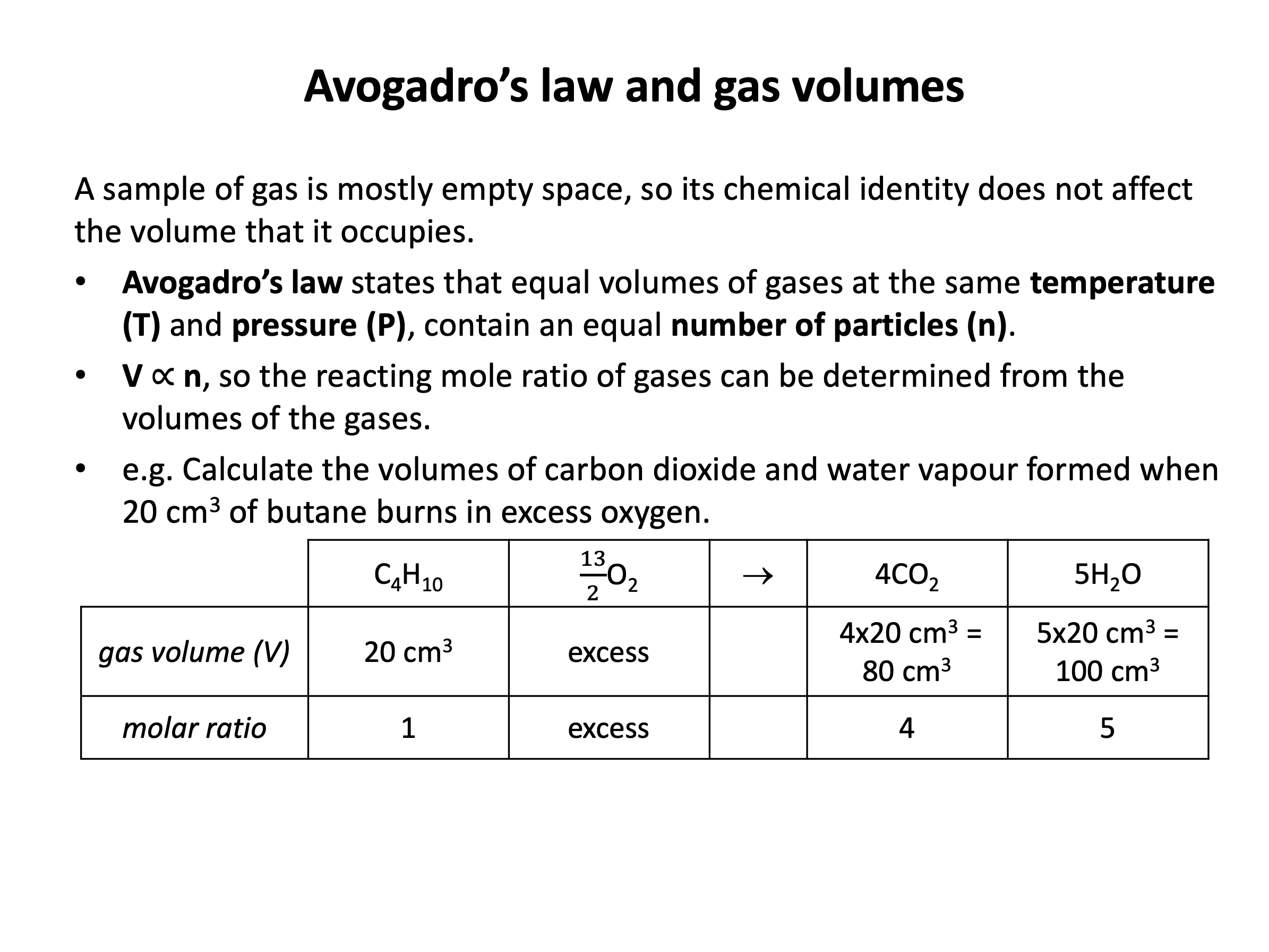 limiting reactant, excess reactant, theoretical yield, experimental yield, percentage yield, Avogadro's law*, ideal gas model, concentration, solution, standard solution