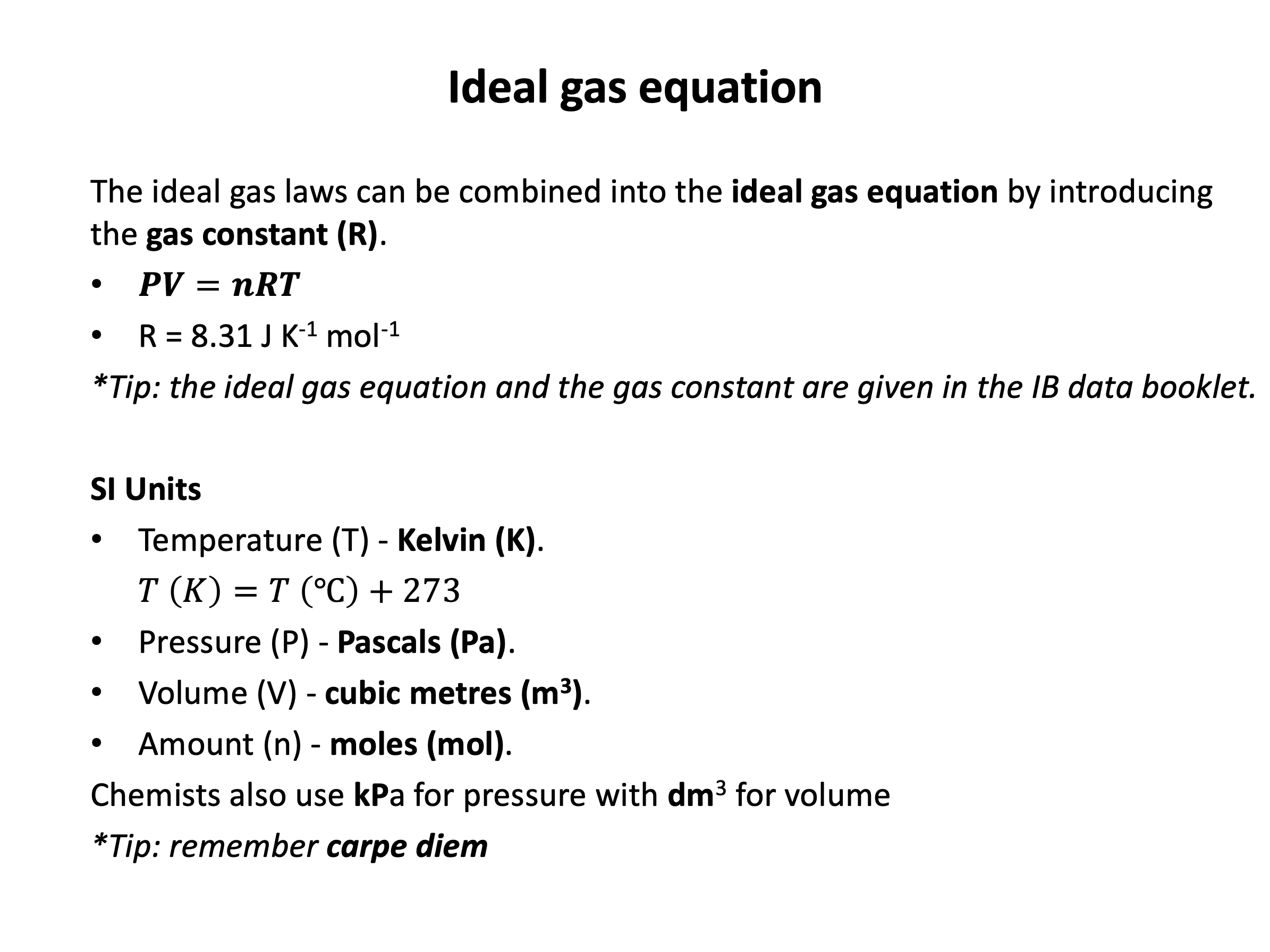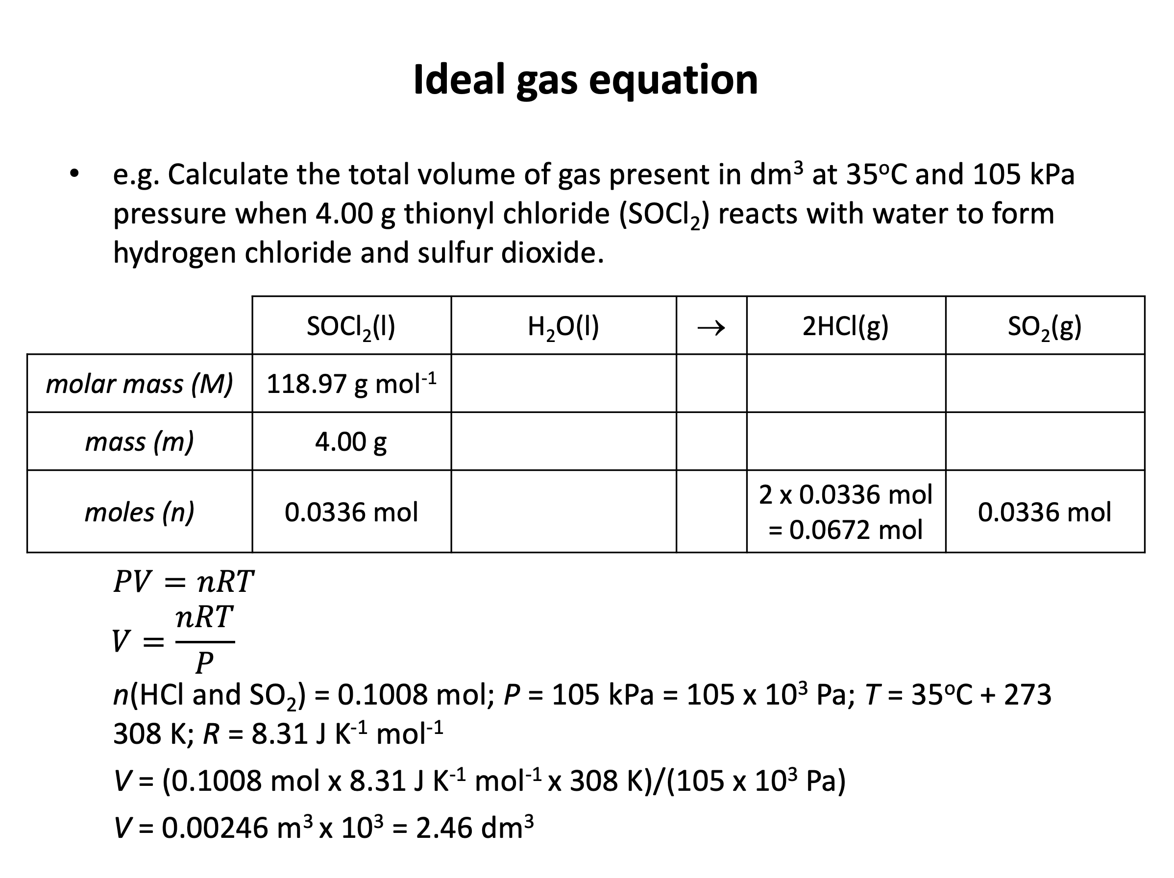 Use PV=nRT (Gas constant, R, given in the data book as 8.31 J K−1 mol−1)