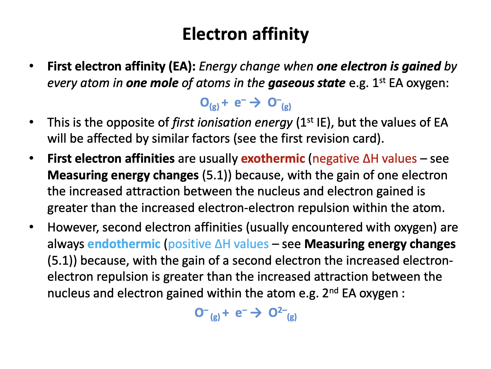 Second electron affinity is the enthalpy change when one electron is gained by each 1− ion in one mole of gaseous ions.