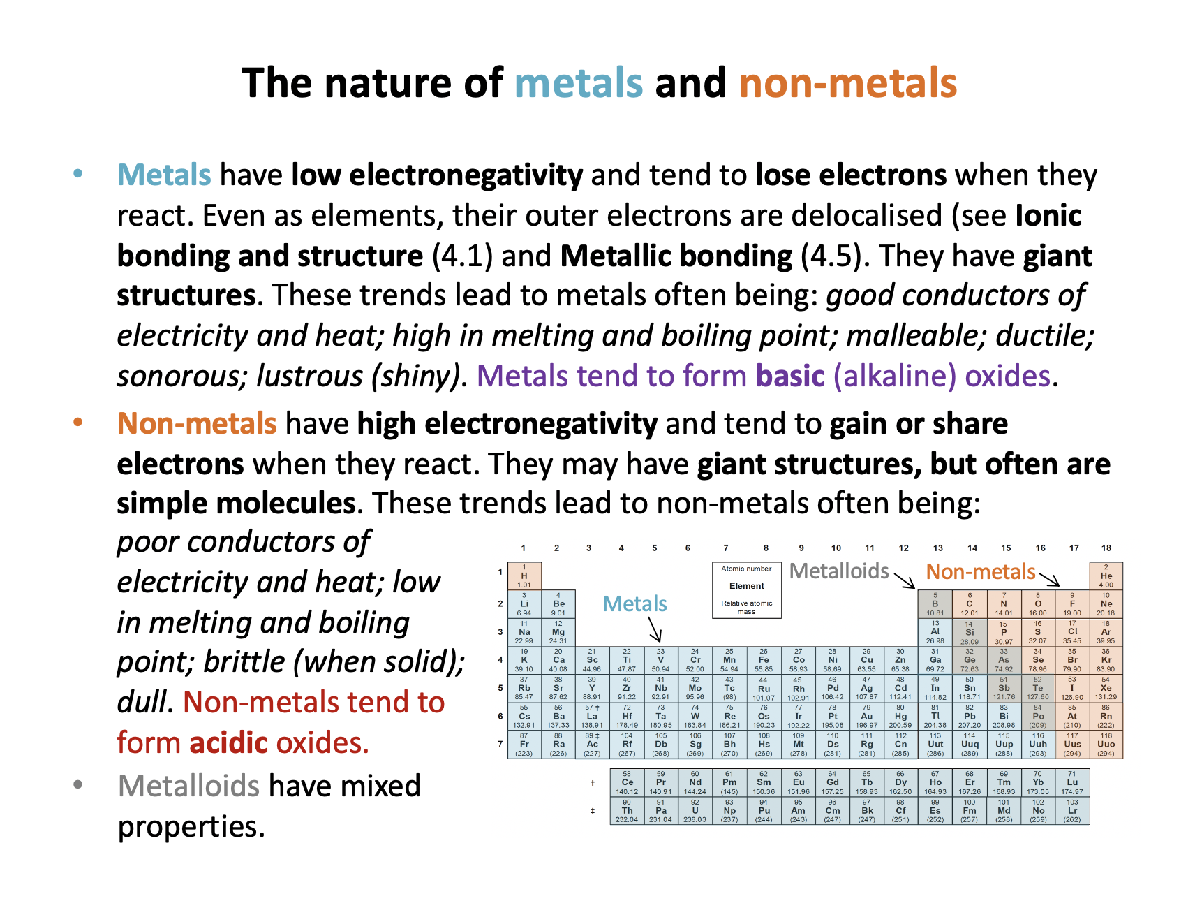 nuclear charge, shielding*, atomic radius, first ionisation energy*, second ionisation energy*, first electron affinity*, second electron affinity*, electronegativity*, properties of metals, properties of non-metals, metalloids, amphoteric, displacement