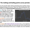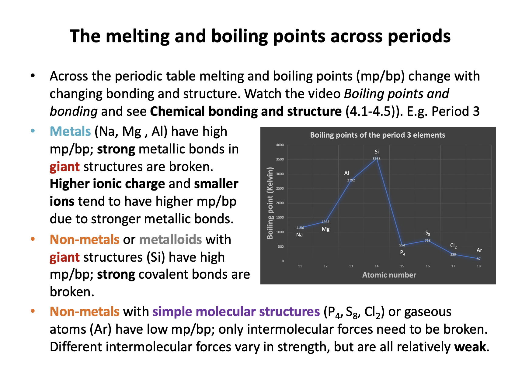 Non-metals with simple molecular structures (S8, Cl2) or gaseous atoms (Ar) have low mp/bp; only intermolecular forces need to be broken. Different intermolecular forces vary in strength, but are all relatively weak. Statement 3 is true - the molecules get smaller and so have weaker London dispersion forces between them.