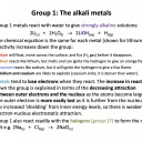 Group 1 metals have metallic bonding and therefore giant structures. Melting points are relatively low for metals as the atoms are large and form 1+ ions so the attraction between the nucleus and ‘sea of electrons’ is not as strong as in other metals. Nonetheless strong metallic bonds must be broken. The melting points (values in data book) become lower down the group because of the increasing atomic/ion size leads to less attraction..