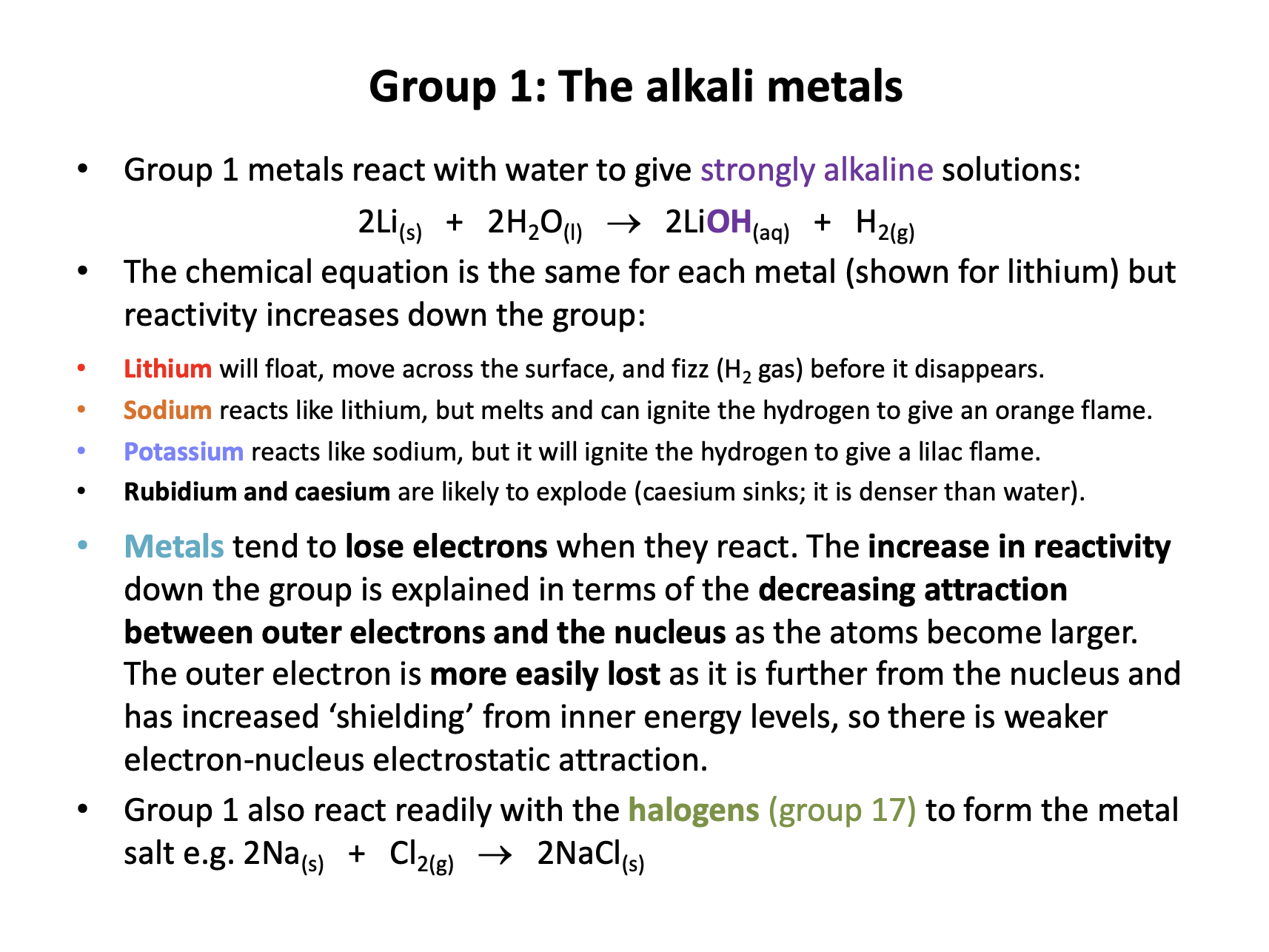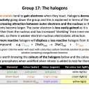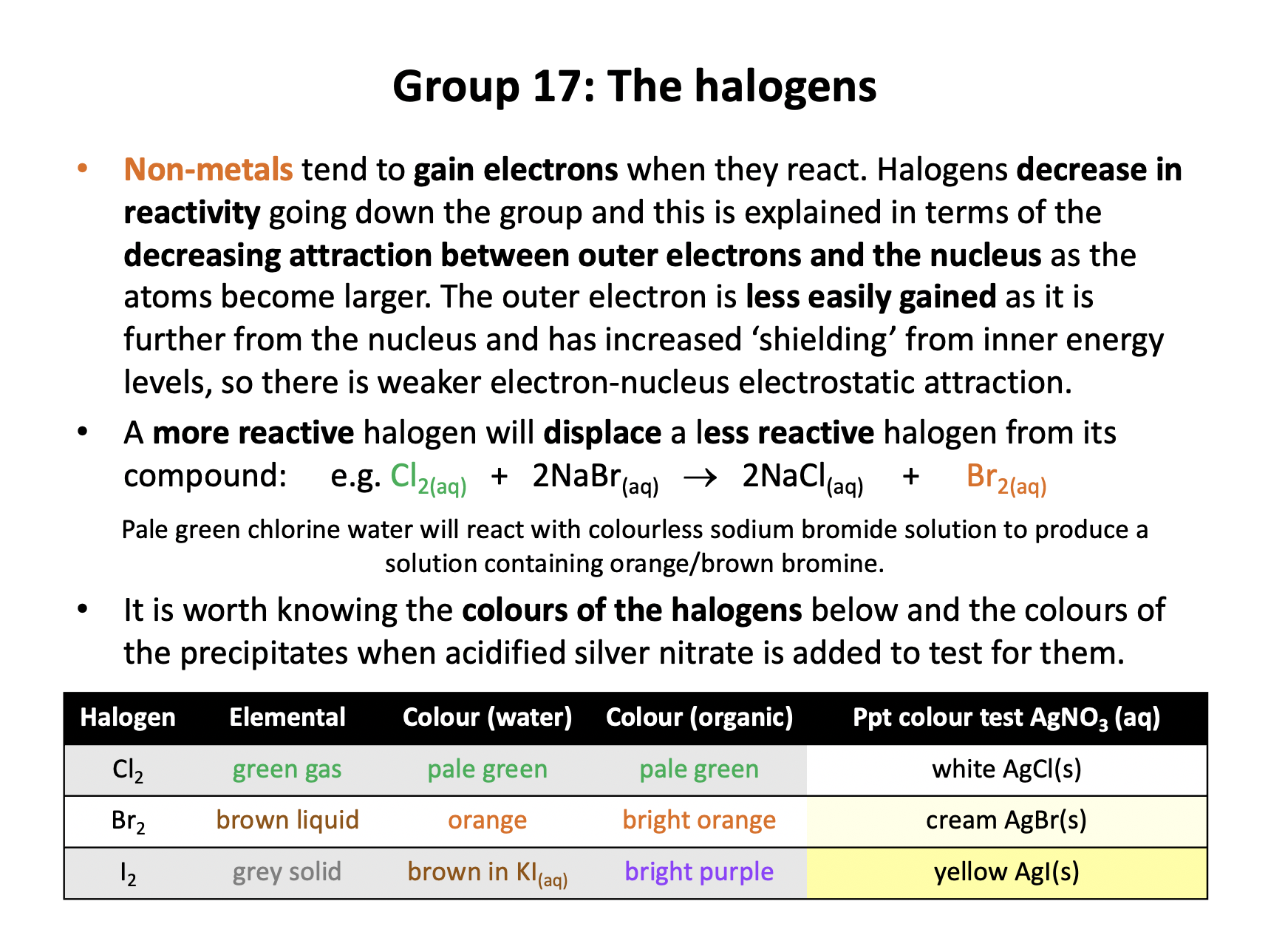 Halogens decrease in reactivity going down the group and this is explained in terms of the decreasing attraction between outer electrons and the nucleus as the atoms become larger. The outer electron is less easily gained as it is further from the nucleus and has increased ‘shielding’ from inner energy levels, so there is weaker electron-nucleus electrostatic attraction.