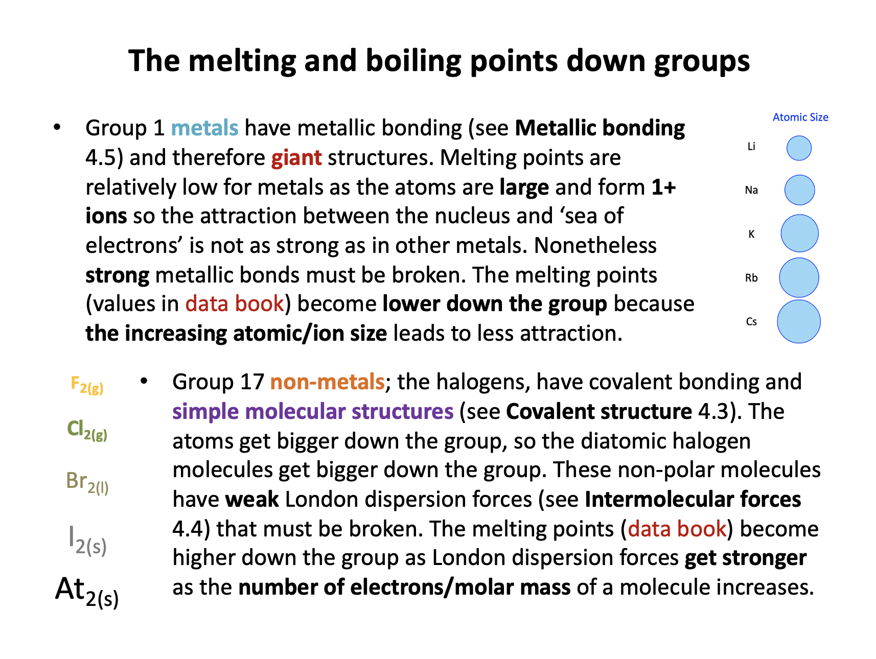 Group 17 non-metals; the halogens, have covalent bonding and simple molecular structures. The atoms get bigger down the group, so the diatomic halogen molecules get bigger down the group. These non-polar molecules have weak London dispersion forces that must be broken. The melting points (data book) become higher down the group as London dispersion forces get stronger as the number of electrons/molar mass of a molecule increases.