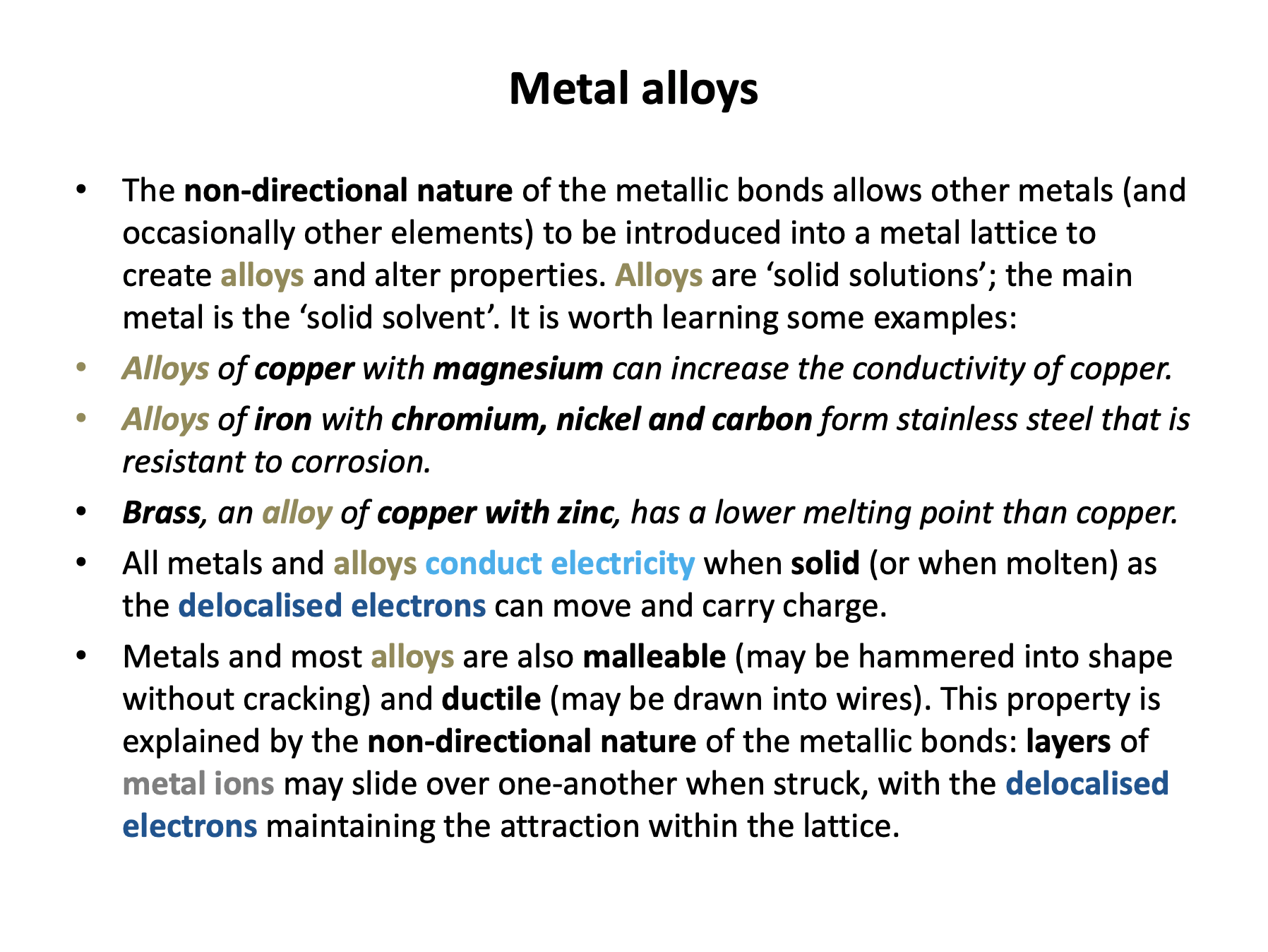 A wide range of alloys have been developed that alter the properties of metals. Because of the non-directional nature of the attraction within the metallic lattice, is it relatively easy to introduce other metal atoms into the lattice to alter properties. 1,2 and 3 is the correct answer e.g.