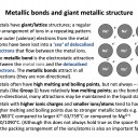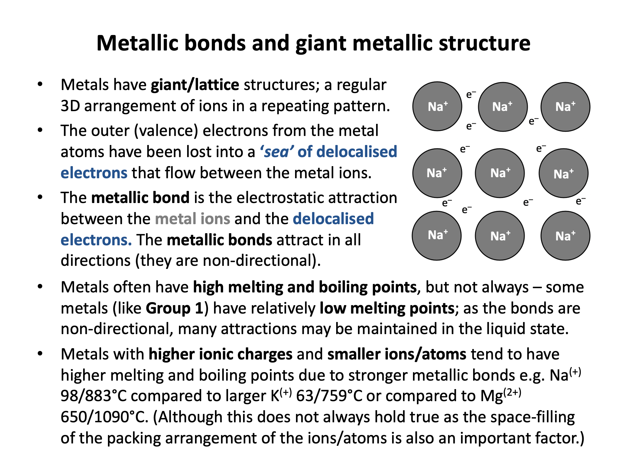 Metals are likely to have high melting and boiling points; they have giant (lattice) structures and it takes a lot of energy to break the network of strong metallic bonds. Metals conduct electricity in the solid state (and when molten) because the delocalised electrons can move and carry charge.