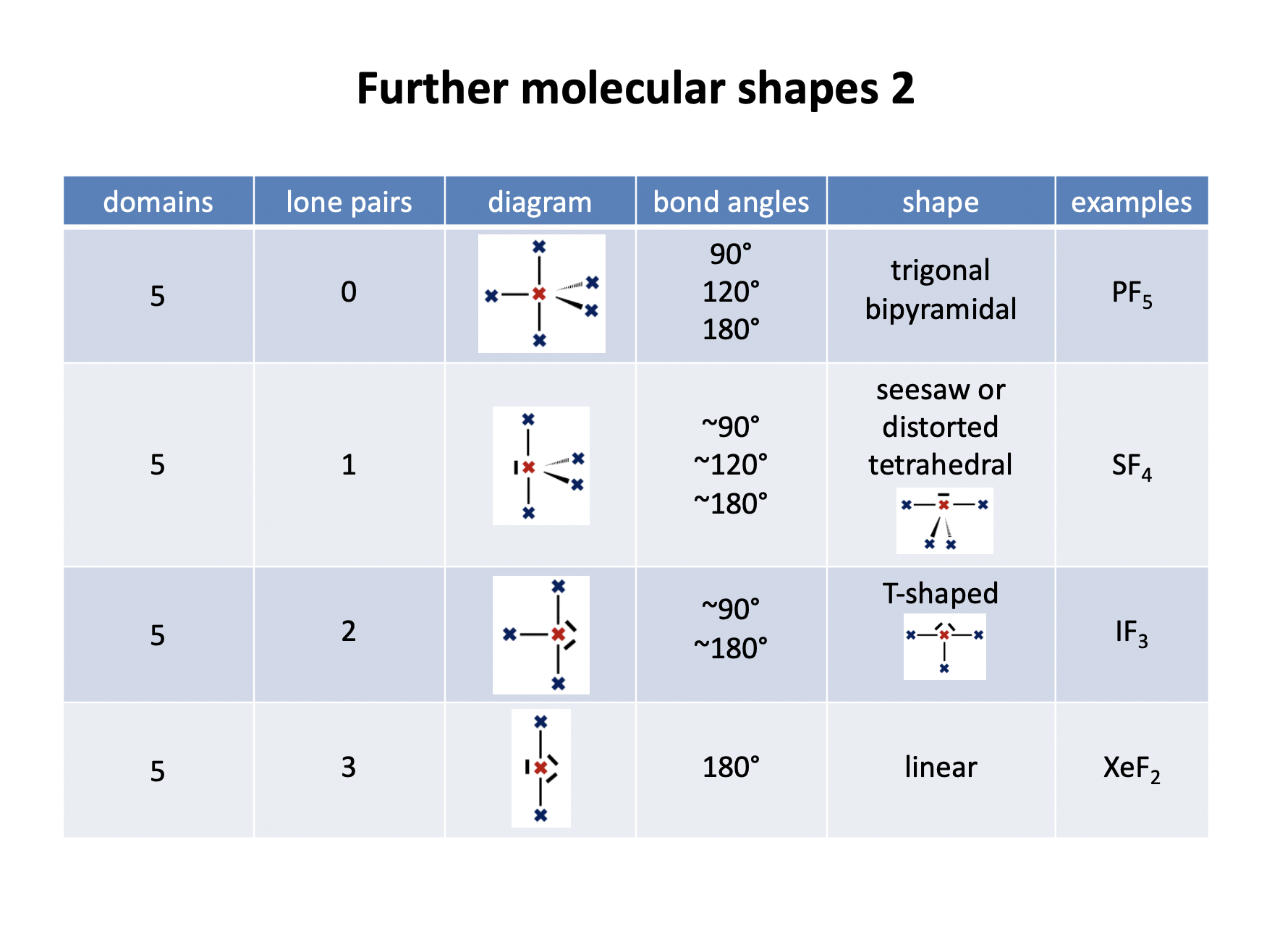 Sulfur tetrafluoride is seesaw (sawhorse) in shape, with bond angles of 90°, 120° and 180°.