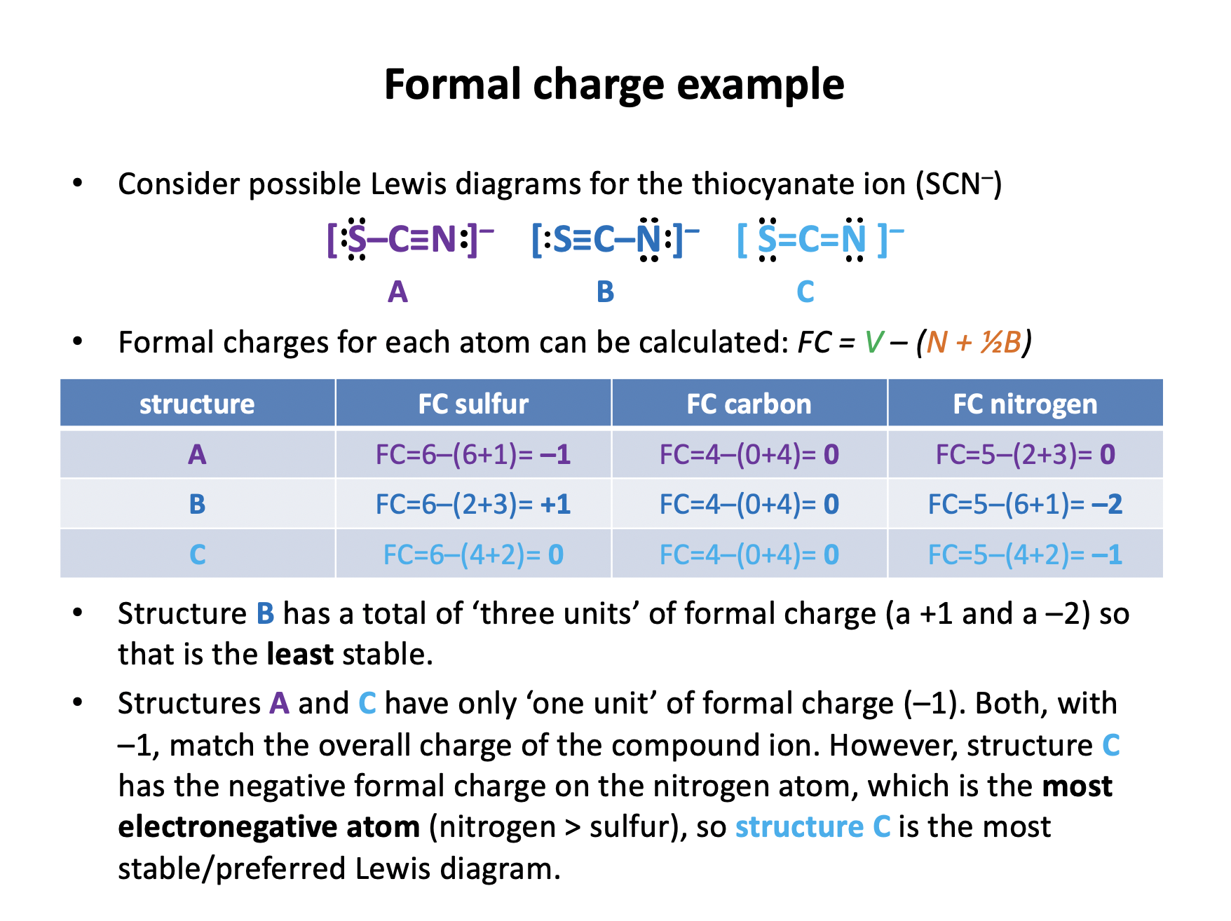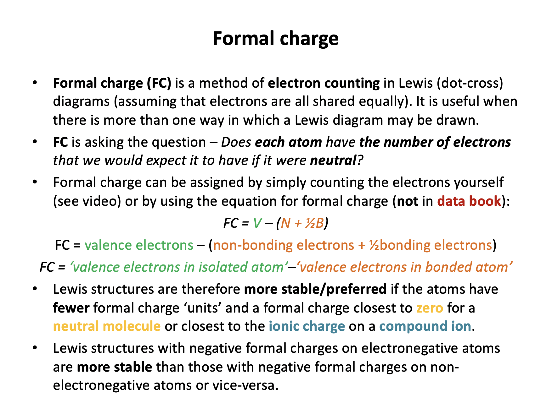 Formal charge = normal valence electrons – (non-bonding electrons + (½ × bonding electrons))