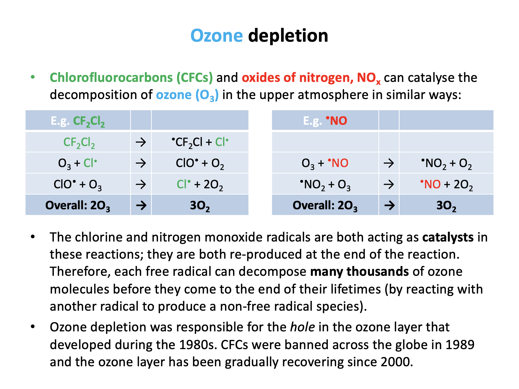 Chlorofluorocarbons (CFCs) and oxides of nitrogen, NOx can catalyse the decomposition of ozone in the upper atmosphere.