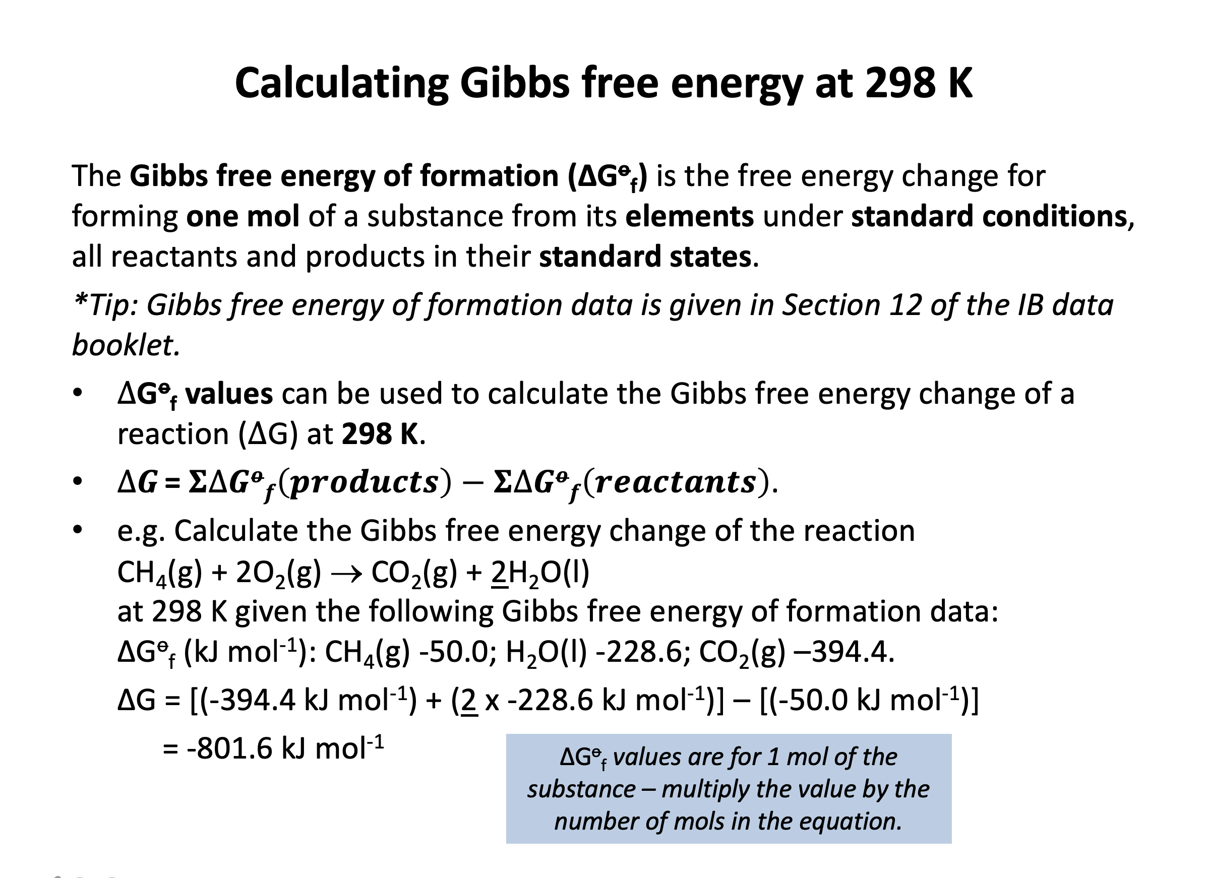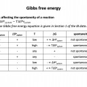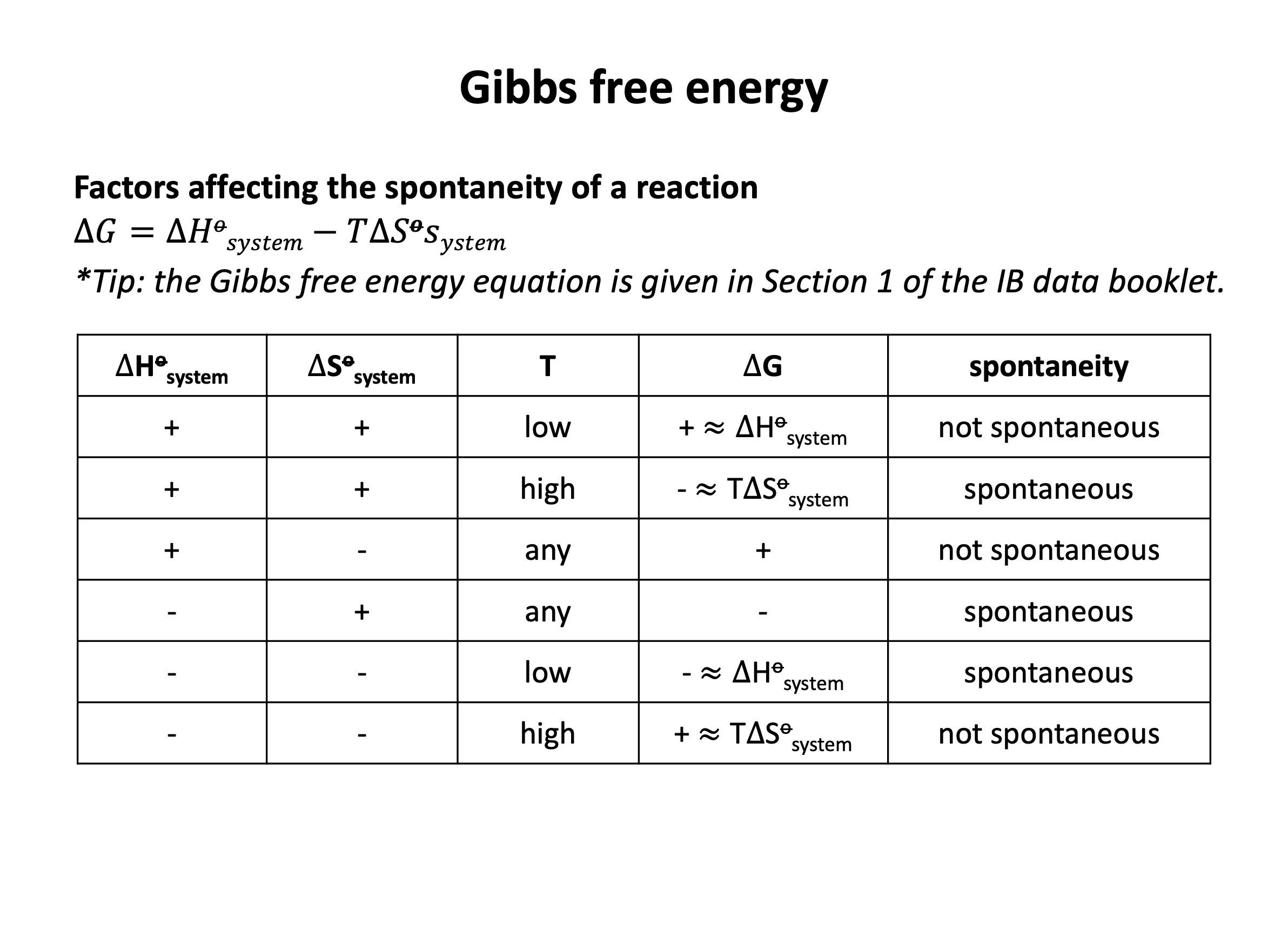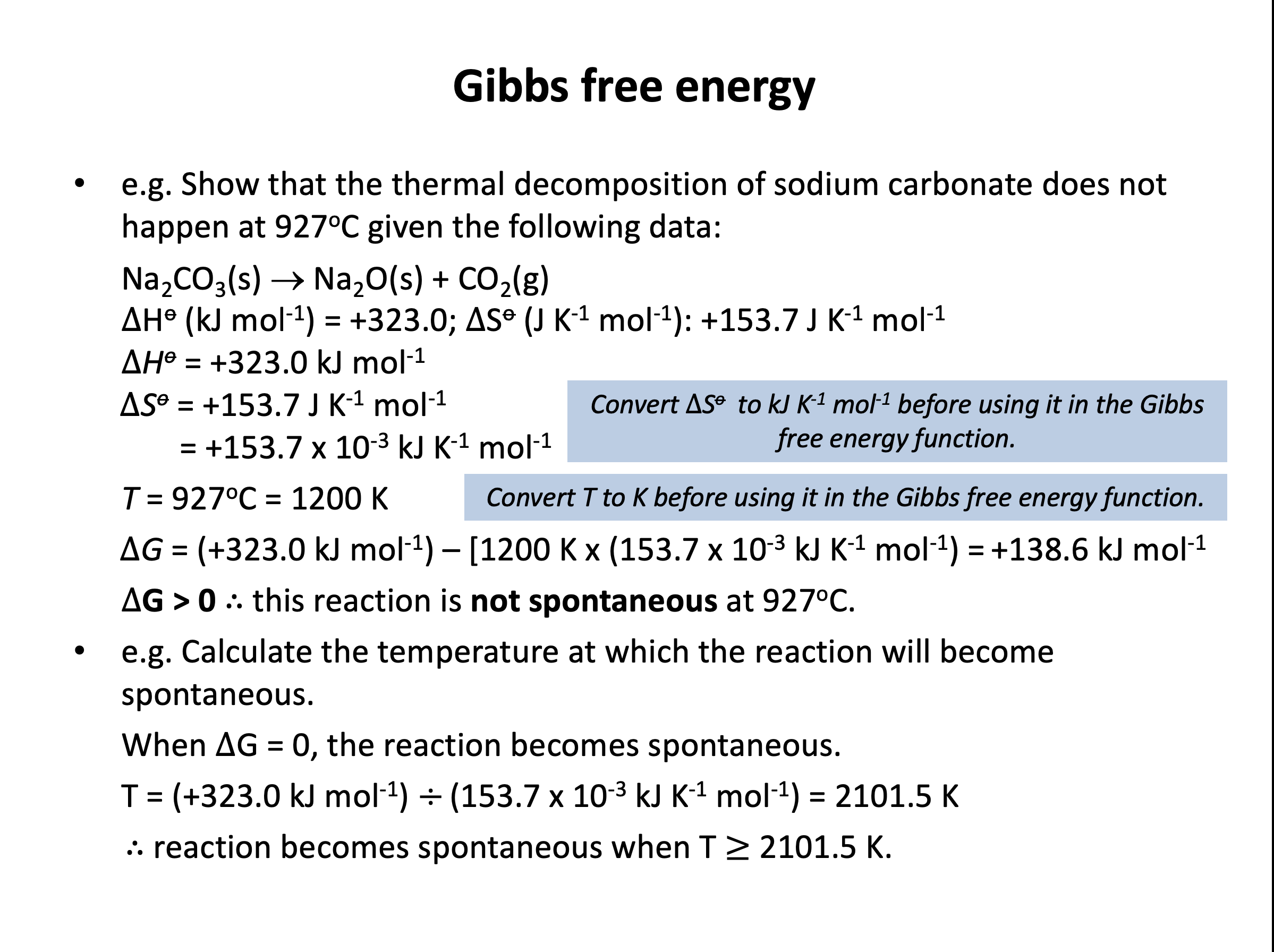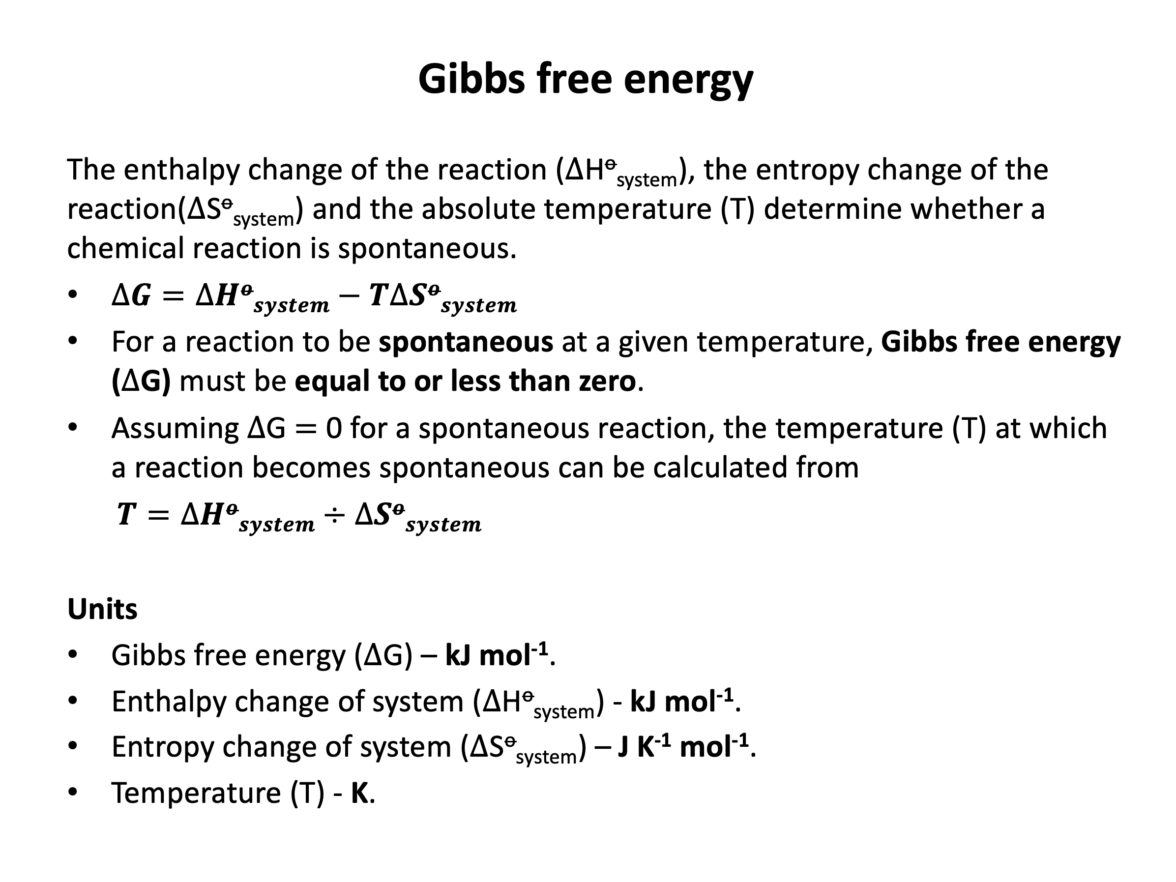 The Gibbs free energy change takes into account both the entropy change of the system and that of the surroundings, the latter a result of the reaction being either exothermic or endothermic. Gibbs free energy calculations are not difficult, but it is easy to trip up by forgetting to convert your entropy energy unit from J to kJ. Refer to revision card 18 to help you organise your working. You should also be able to predict the spontaneity of a process knowing the enthalpy change of the system, the entropy change of the system and the reaction temperature. Remember that a spontaneous reaction here refers to a reaction that is thermodynamically feasible and does not give any indication about the rate of the reaction.