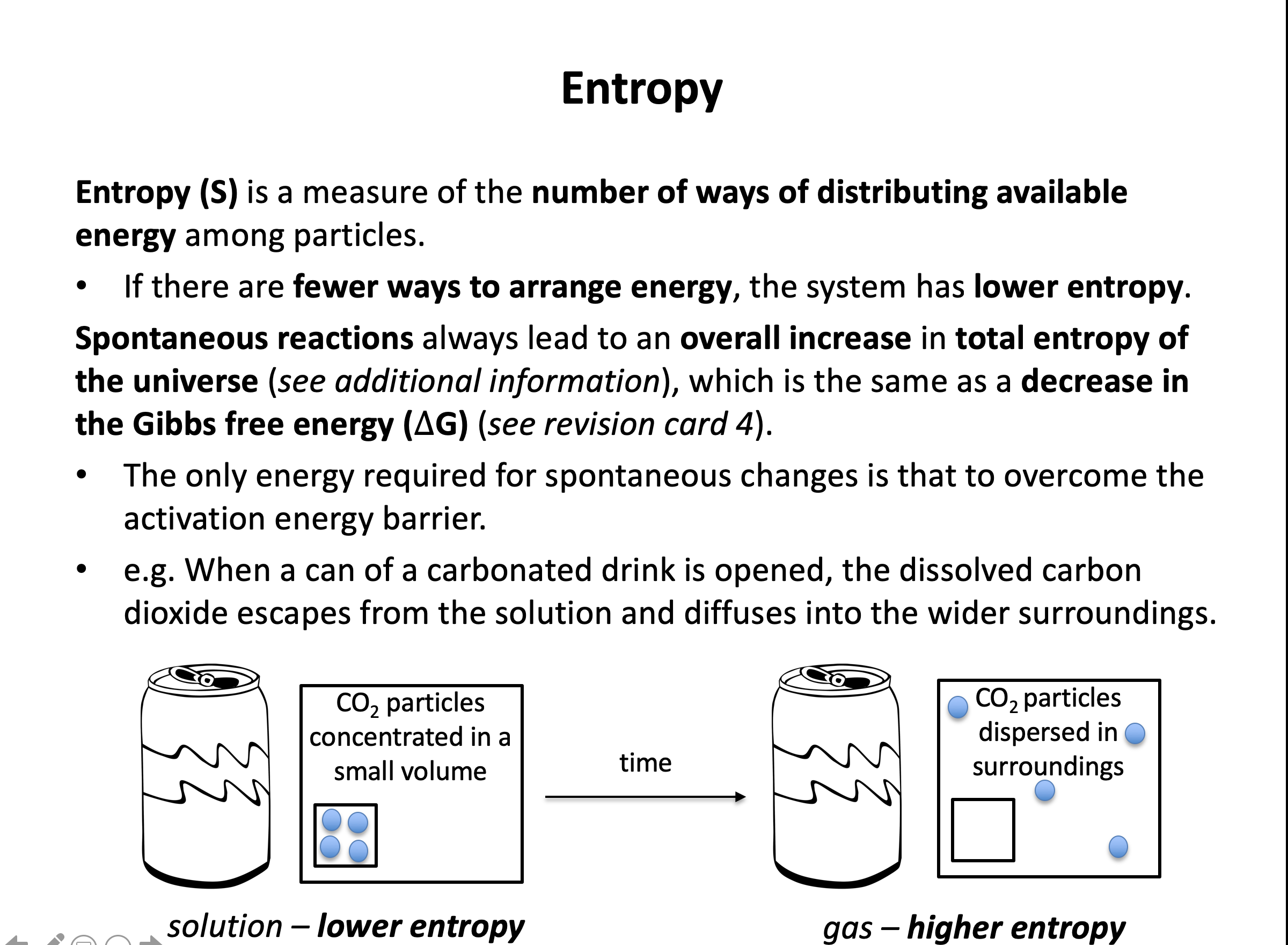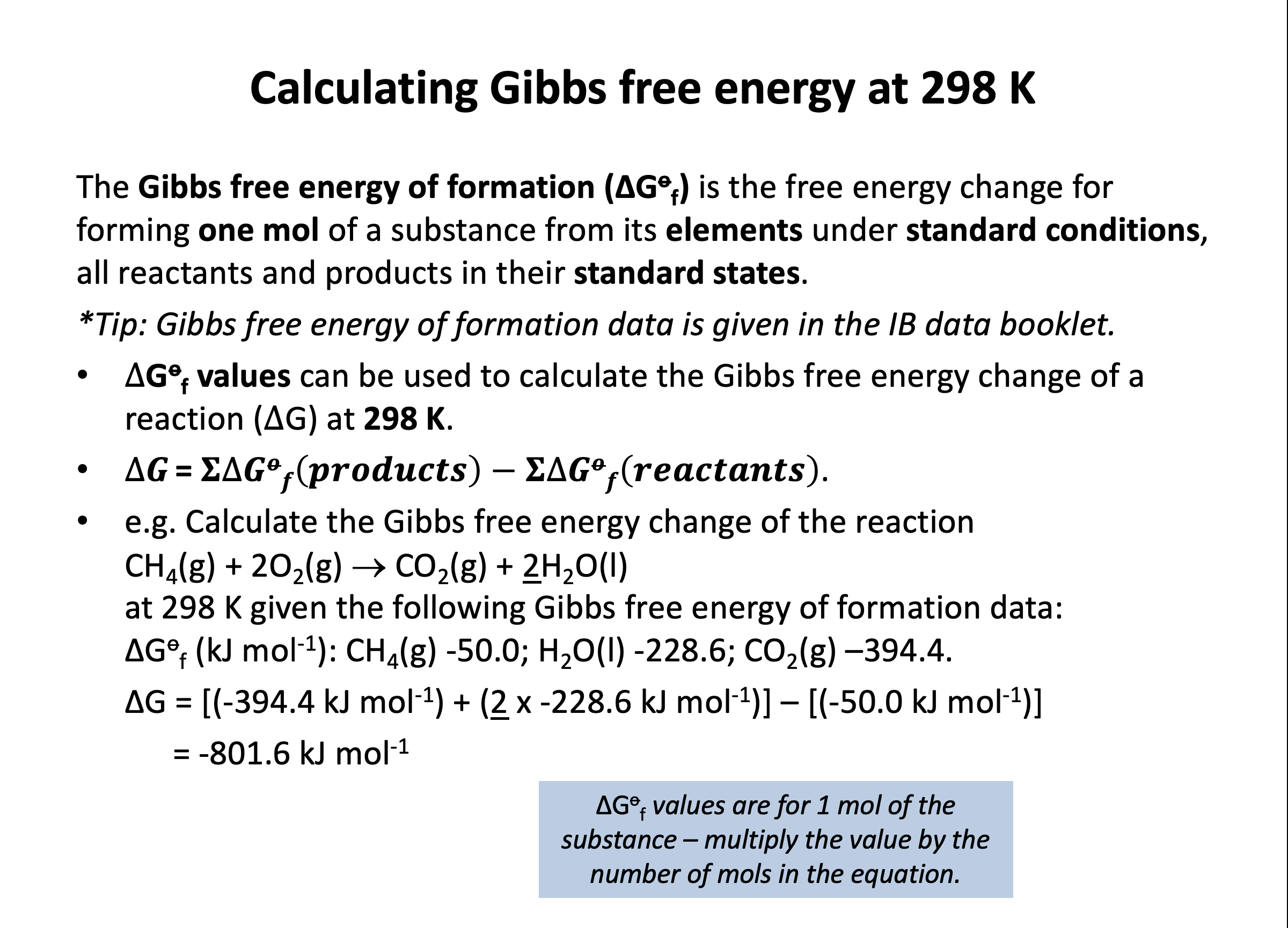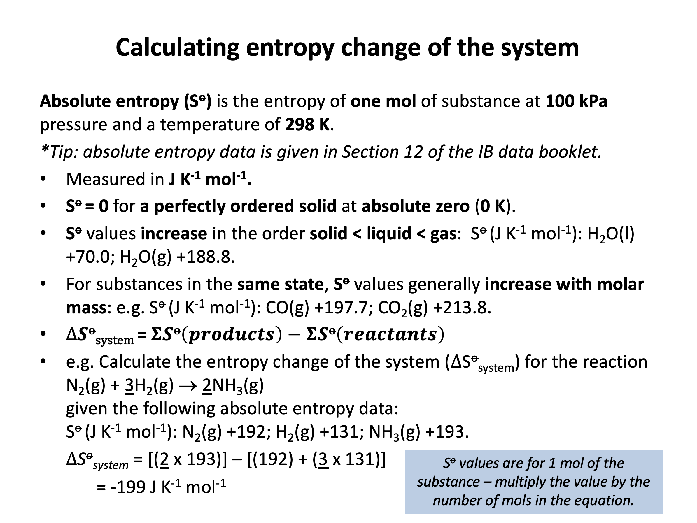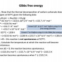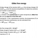 The Gibbs free energy change takes into account both the entropy change of the system and that of the surroundings, the latter a result of the reaction being either exothermic or endothermic. Gibbs free energy calculations are not difficult, but it is easy to trip up by forgetting to convert your entropy energy unit from J to kJ. Refer to revision card 18 to help you organise your working. You should also be able to predict the spontaneity of a process knowing the enthalpy change of the system, the entropy change of the system and the reaction temperature. Remember that a spontaneous reaction here refers to a reaction that is thermodynamically feasible and does not give any indication about the rate of the reaction.