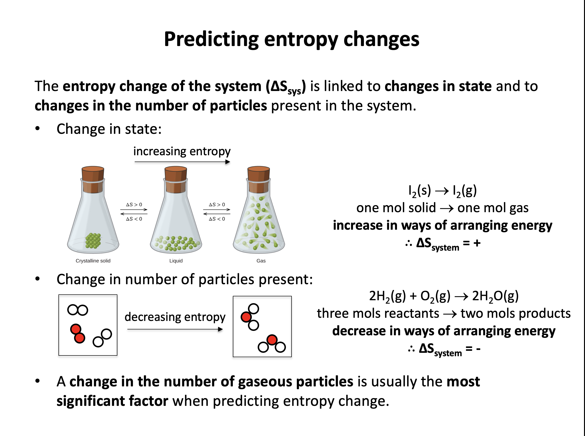 According to the second law of thermodynamics, a process is spontaneous if it causes the total entropy of universe to increase. Entropy is a measure of the number of ways in which the energy in a system can be arranged. Use the practice questions to help you become more confident in predicting which systems have a positive entropy change. You should also be able to calculate the entropy change of a system using absolute entropy values.