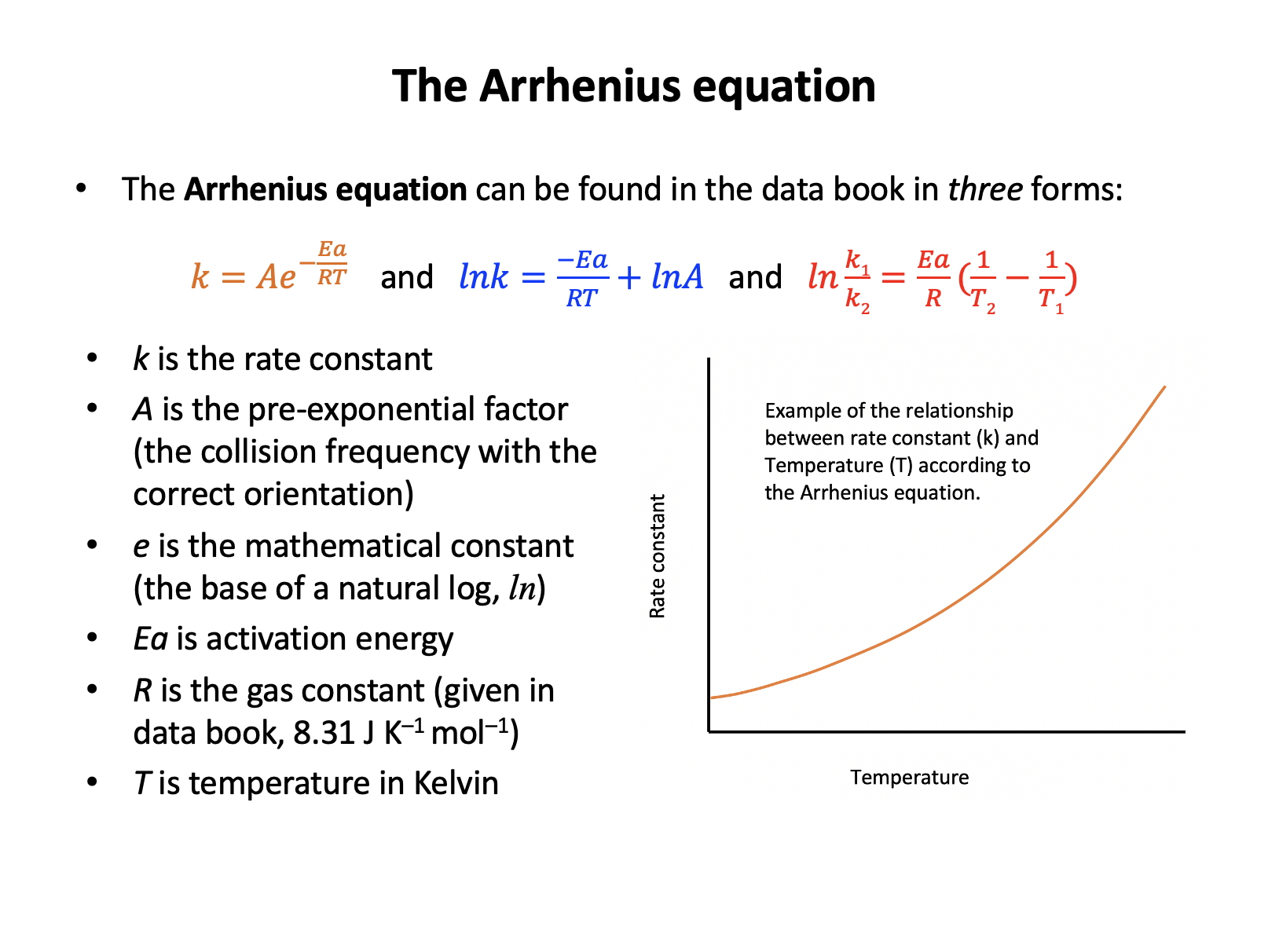 The temperature term has been separated from the activation energy term, and this makes it easier to see that if y = lnk and x = 1/T then the gradient, m, will be –Ea/R and the intercept, c, will be lnA.