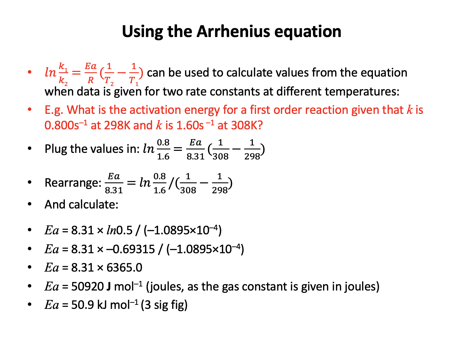 The activation energy must be converted to J (rather than kJ) since the gas constant R (given in the data book) has a value of 8.31 J K−1 mol−1. Ea = 40000 J mol−1.