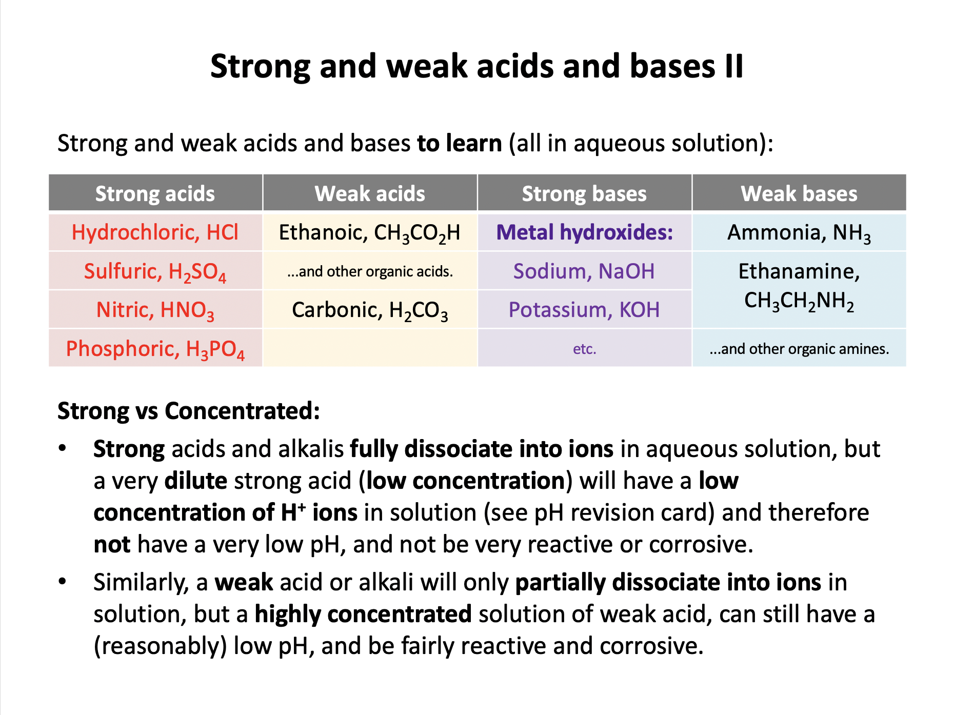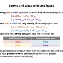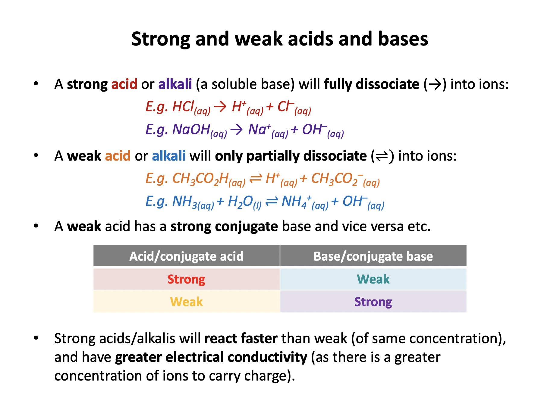 Strong acids and alkalis fully dissociate into ions in aqueous solution, weak acids and alkalis only partially dissociate. Strong acids and alkalis will react faster than weak acids and alkalis, and will have greater electrical conductivity.