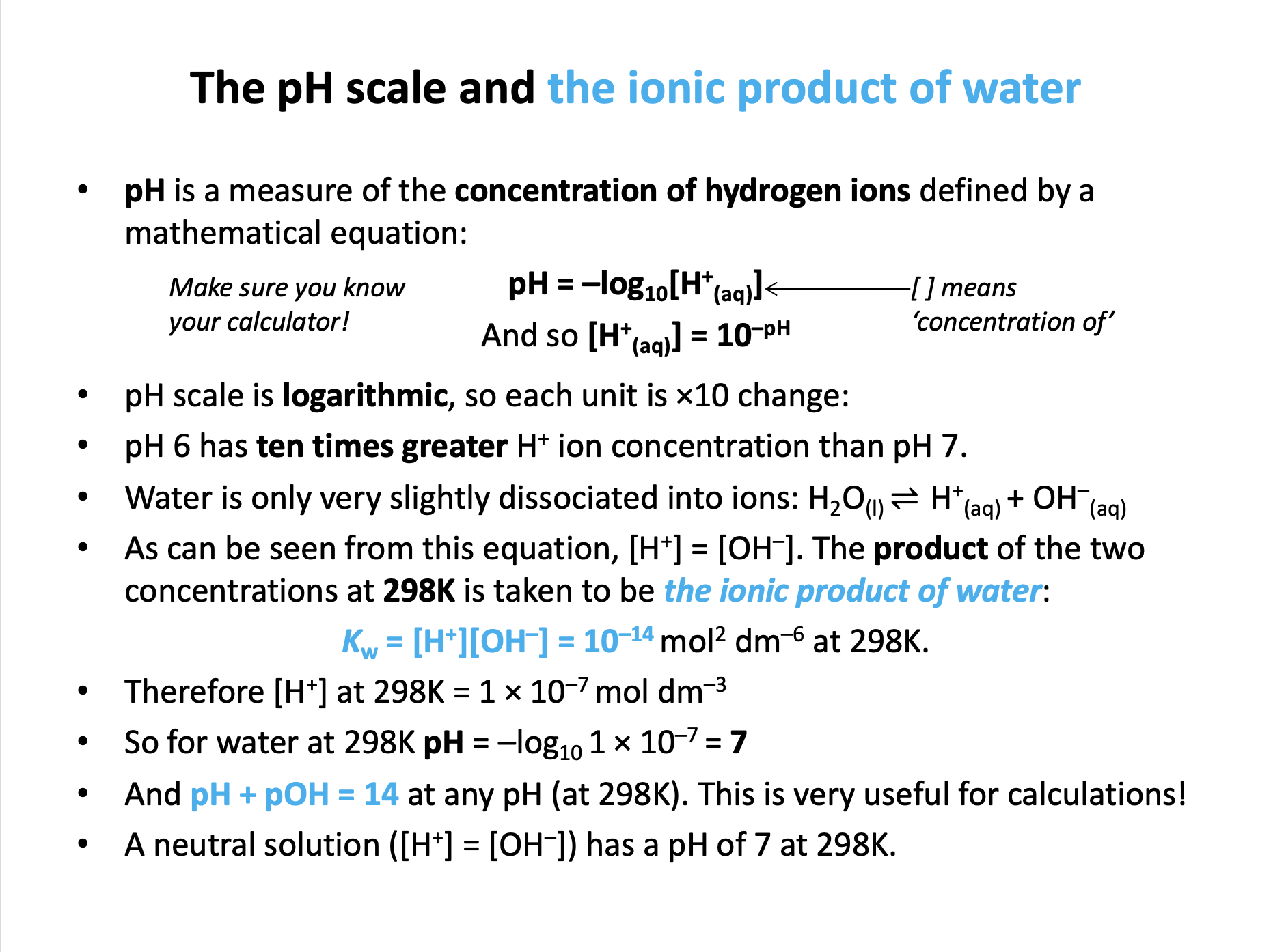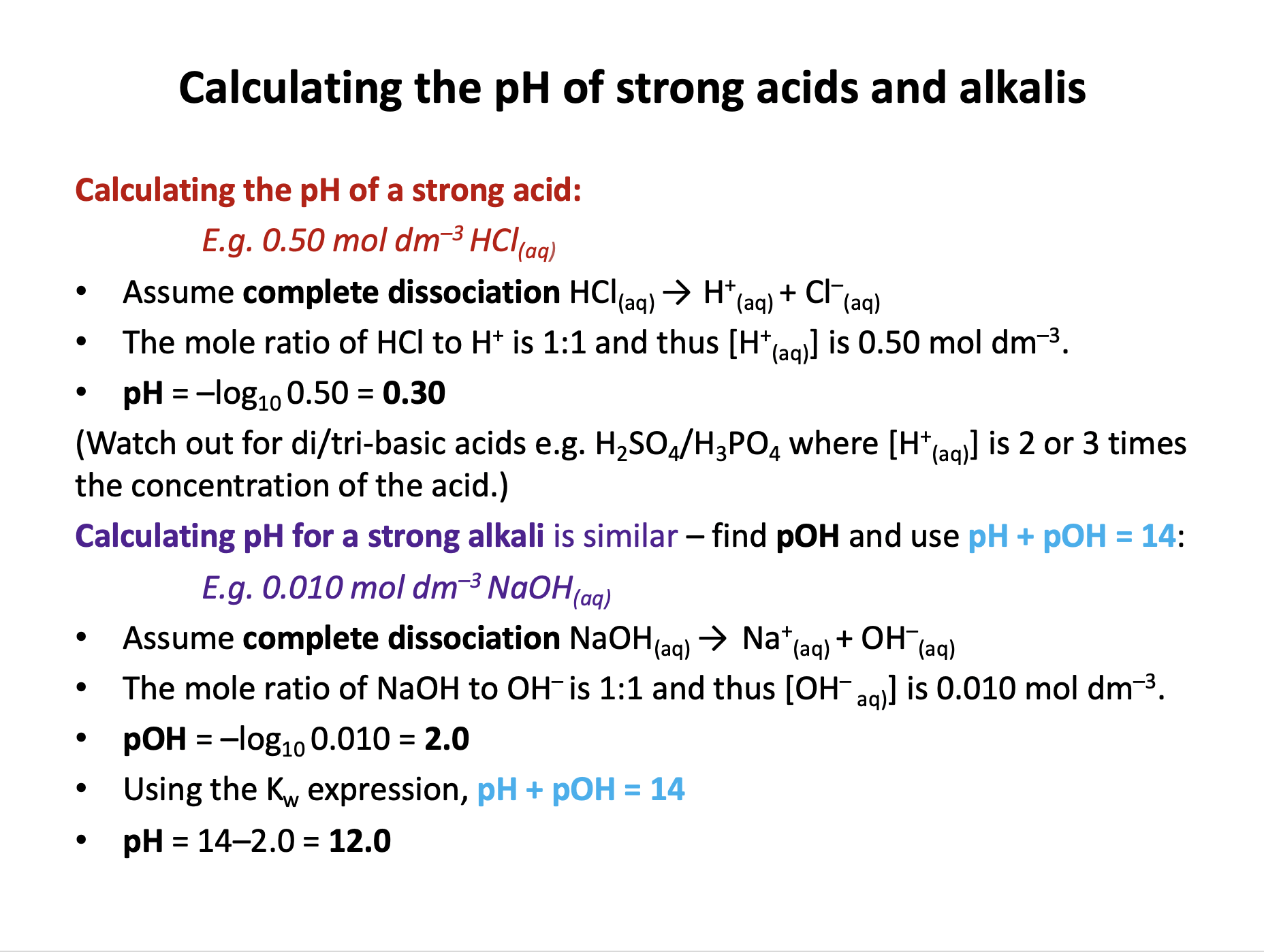 This section follows on directly from Theories and properties of acids and bases 8.1 and 8.2, so it is worth ensuring a thorough grasp of that content before beginning revision here. The concepts are relatively straightforward, but the introduction of pH (a logarithmic scale) can be a challenge mathematically. Ensure that you know your calculator well!