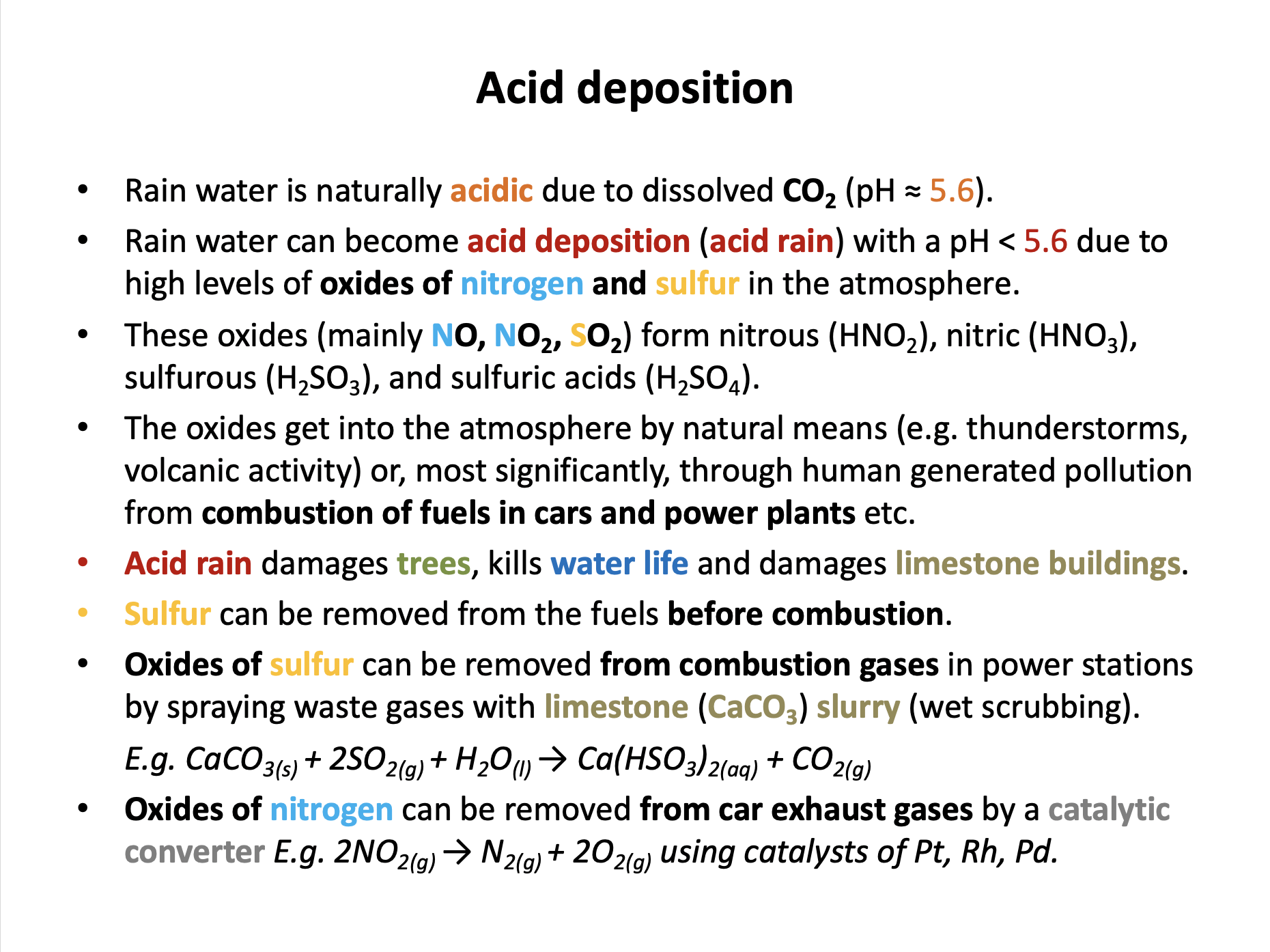 Acid deposition can be prevented by spraying waste gases with a limestone slurry (wet scrubbing in factory chimneys for example) or by passing waste gases through a catalytic converter (in cars for example).