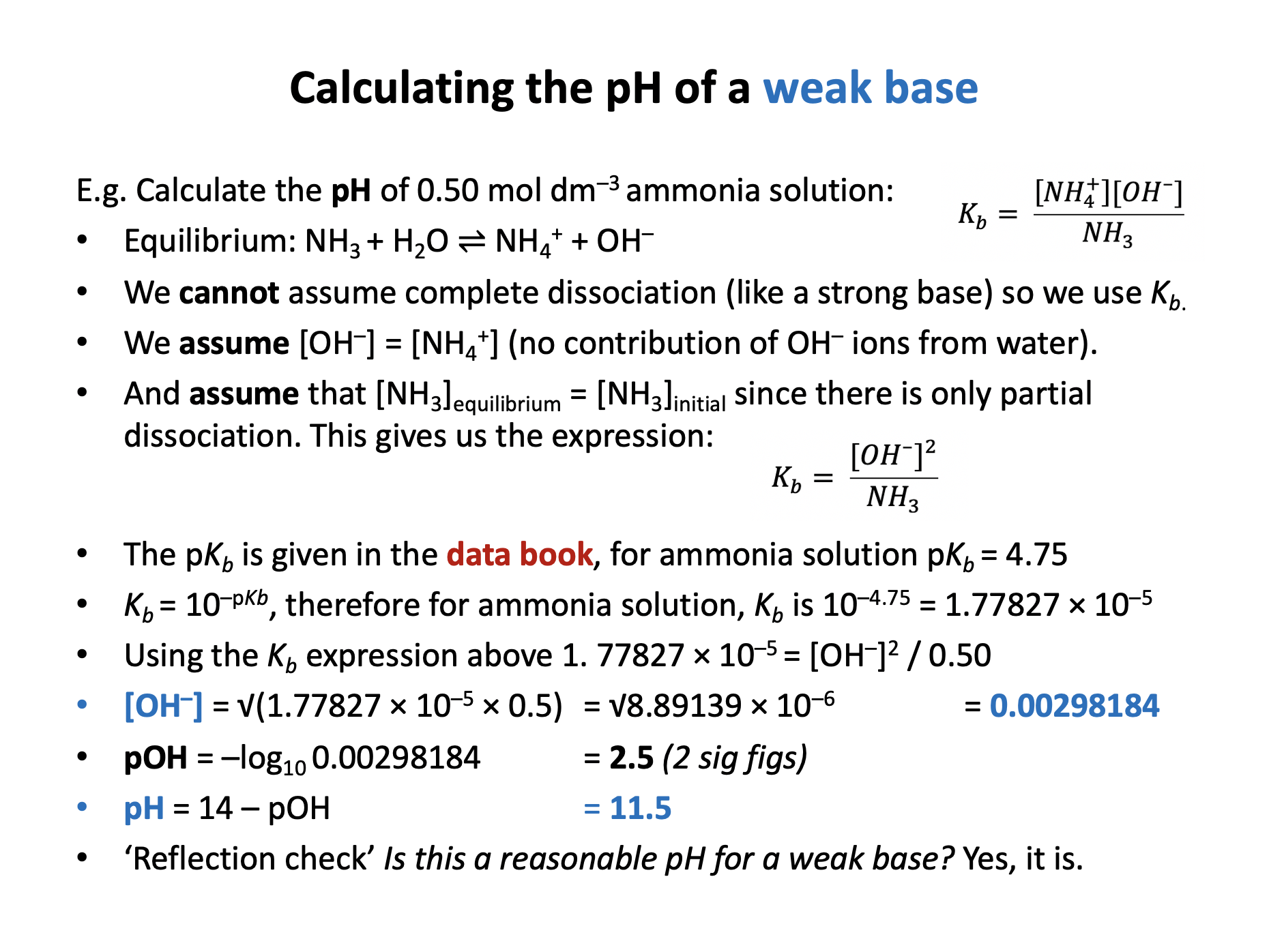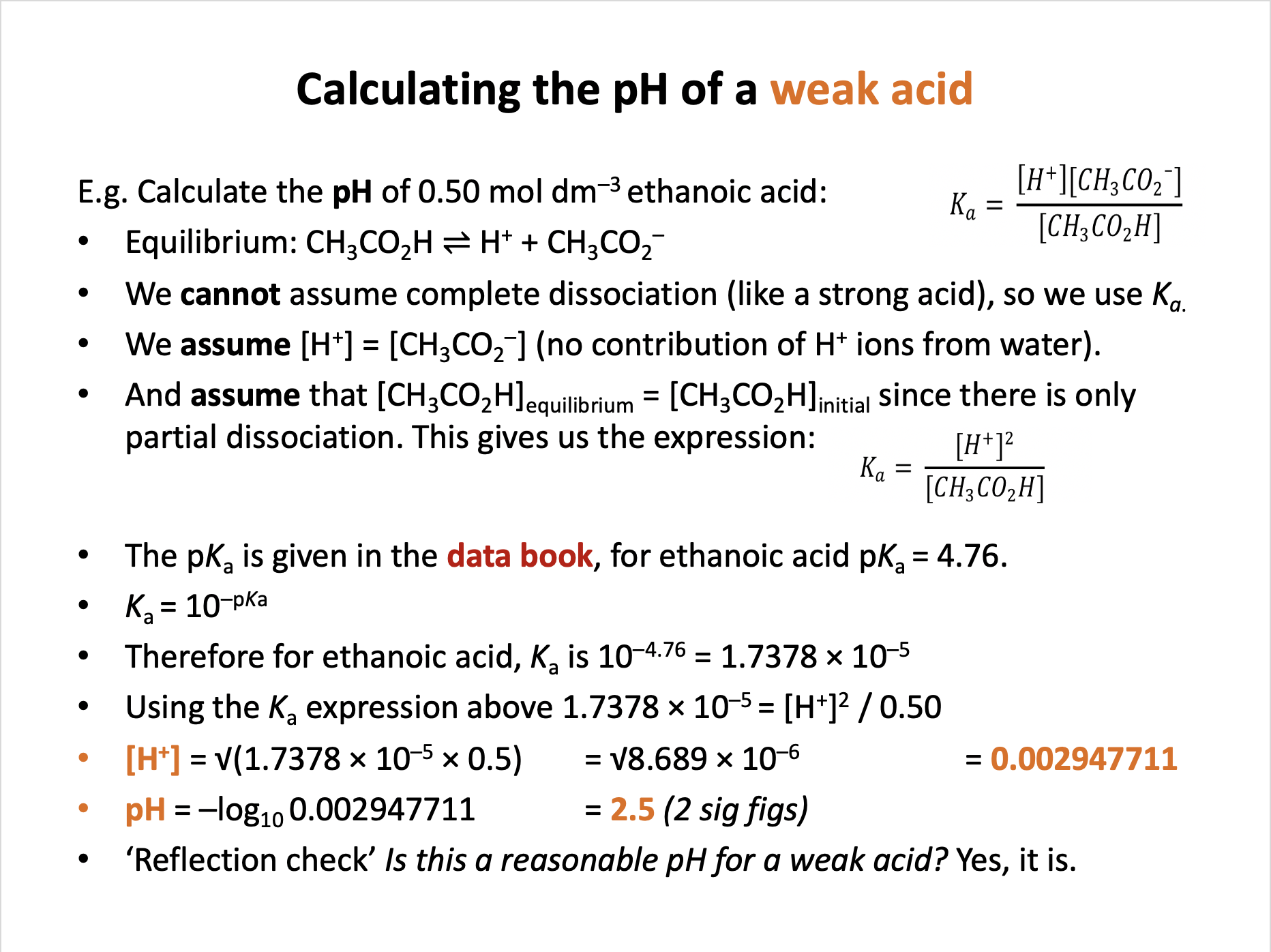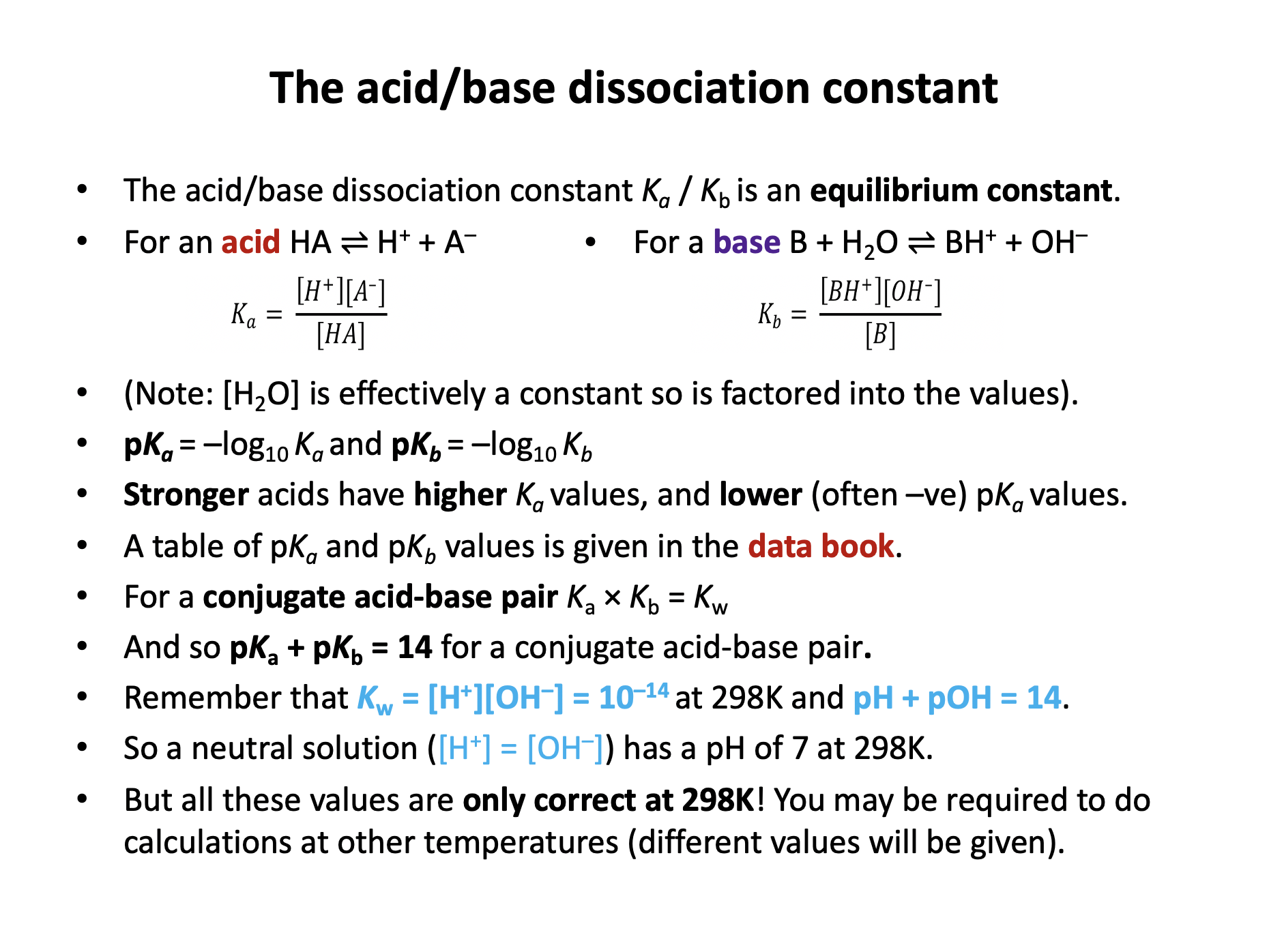 This section is focused on calculations, so there is not a lot of information to learn. However, weak acid and base calculations always crop up in the exam paper somewhere, so it is important to understand the relationships between the variables and the constants in this topic and to ensure practice in the calculations.