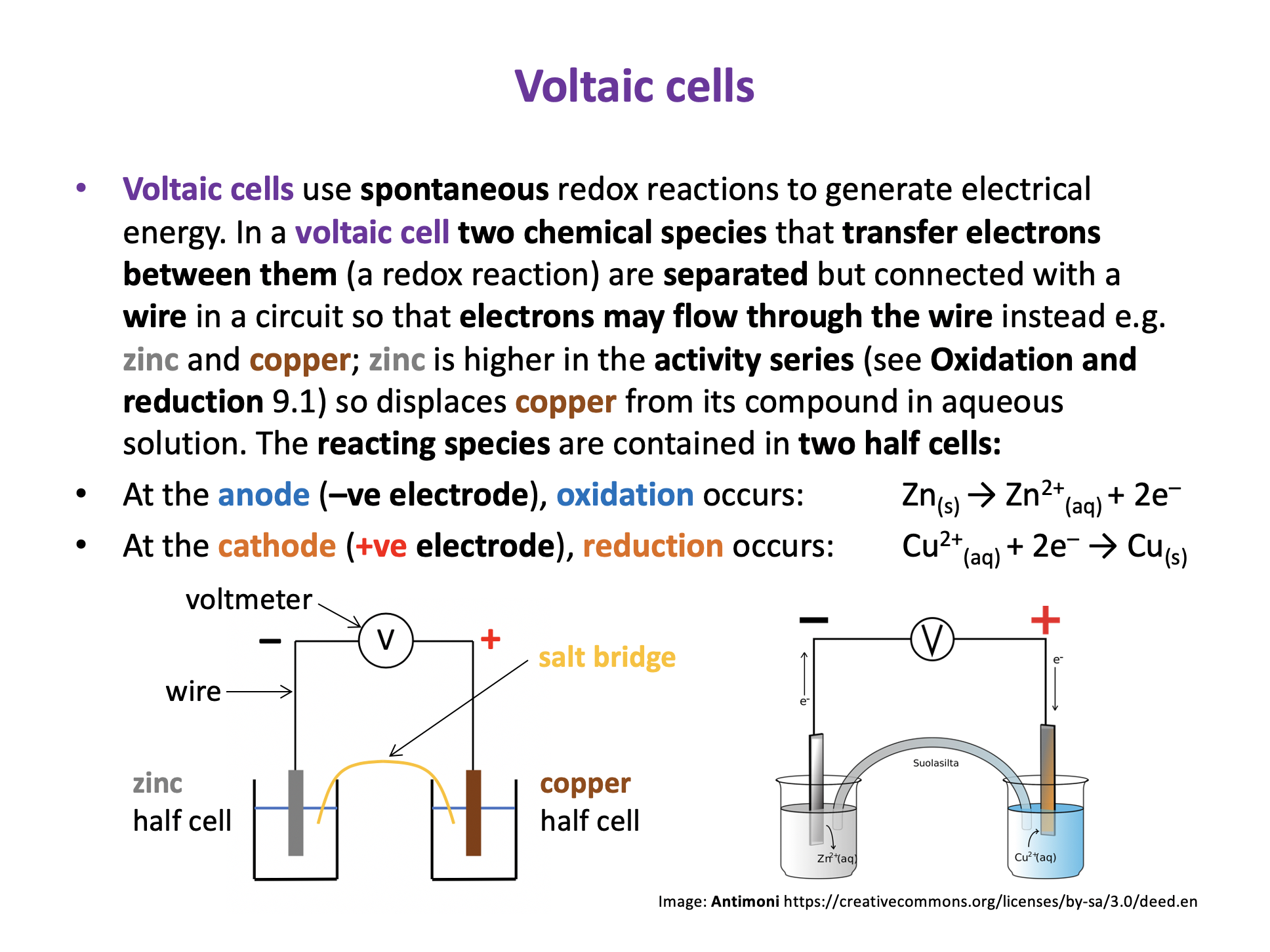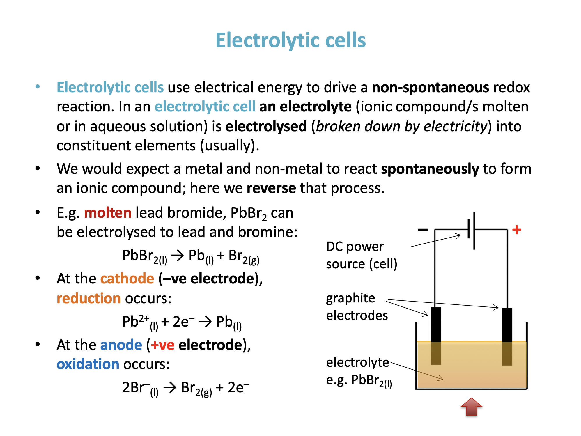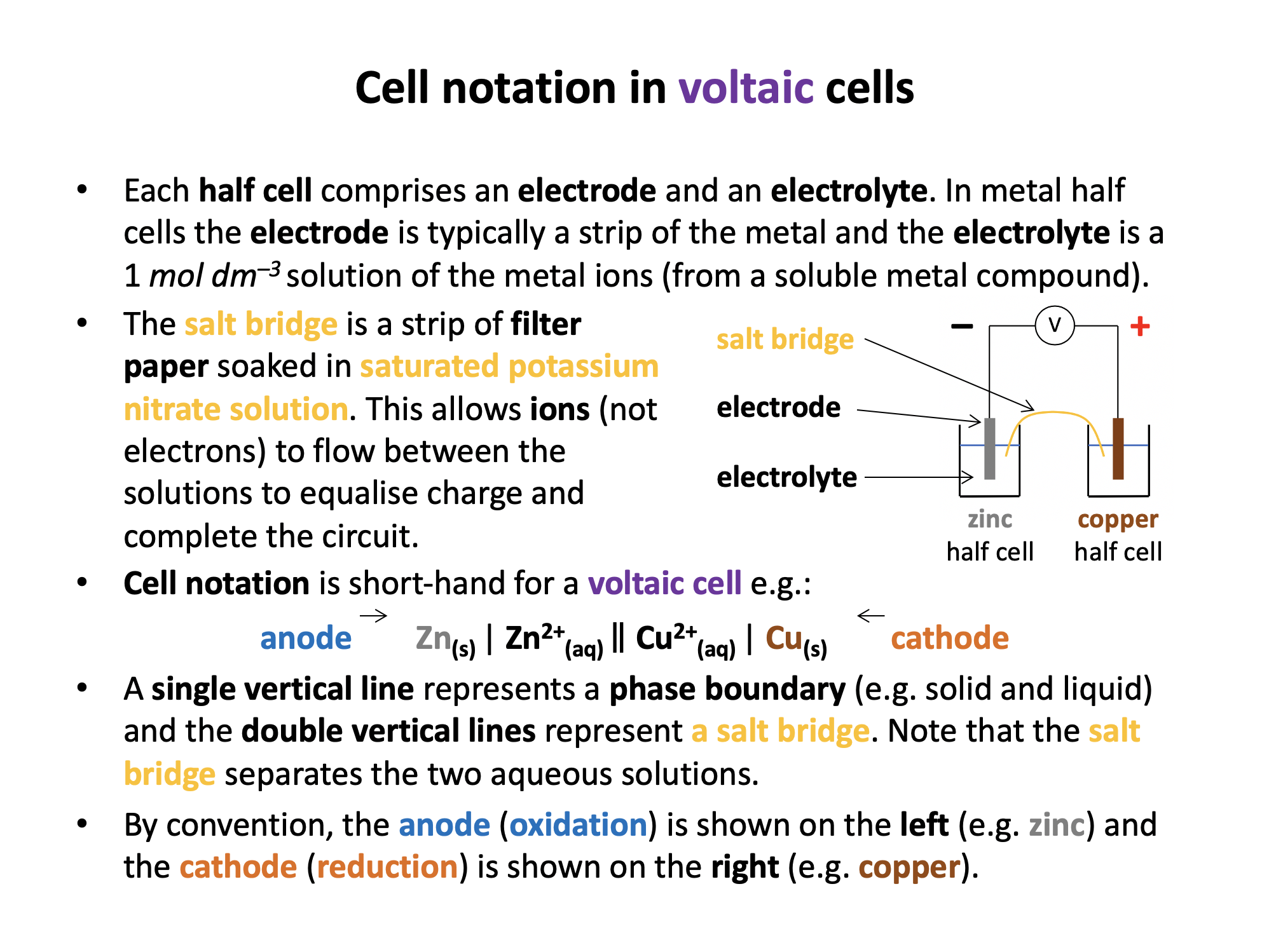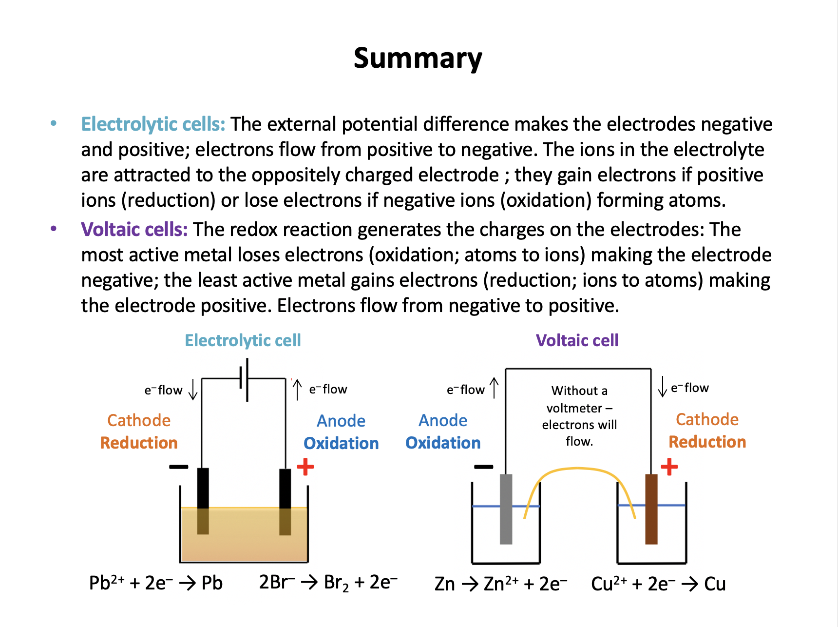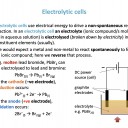 Electrolytic cell, Electrolysis, Voltaic cell, Electrode, Electrolyte, Spontaneous reaction, Non-spontaneous reaction, Potential difference, Half-cell, Cathode, Anode, Cell reaction, Cell notation, Salt bridge, Voltmeter
