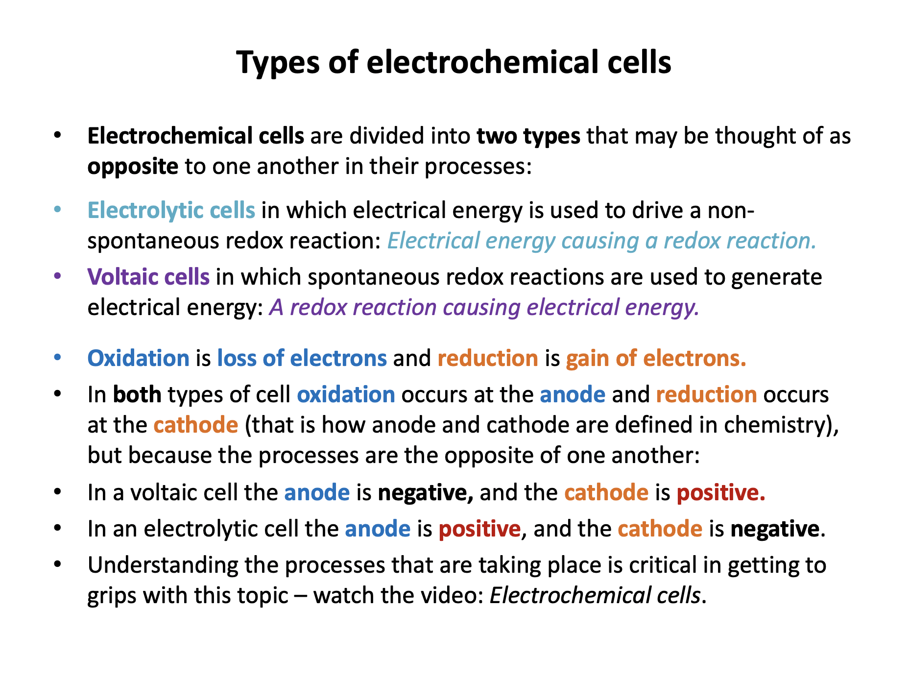 Electrochemical cells is undoubtedly one of the most challenging topics in the course to get the head around. The principles of redox are straightforward - the loss and gain of electrons - but the concept is applied in different contexts in voltaic and electrochemical cells. Watch the video, read the revision cards and test yourself. If you really get to grips with understanding the differences between the cells it is no mean feat!