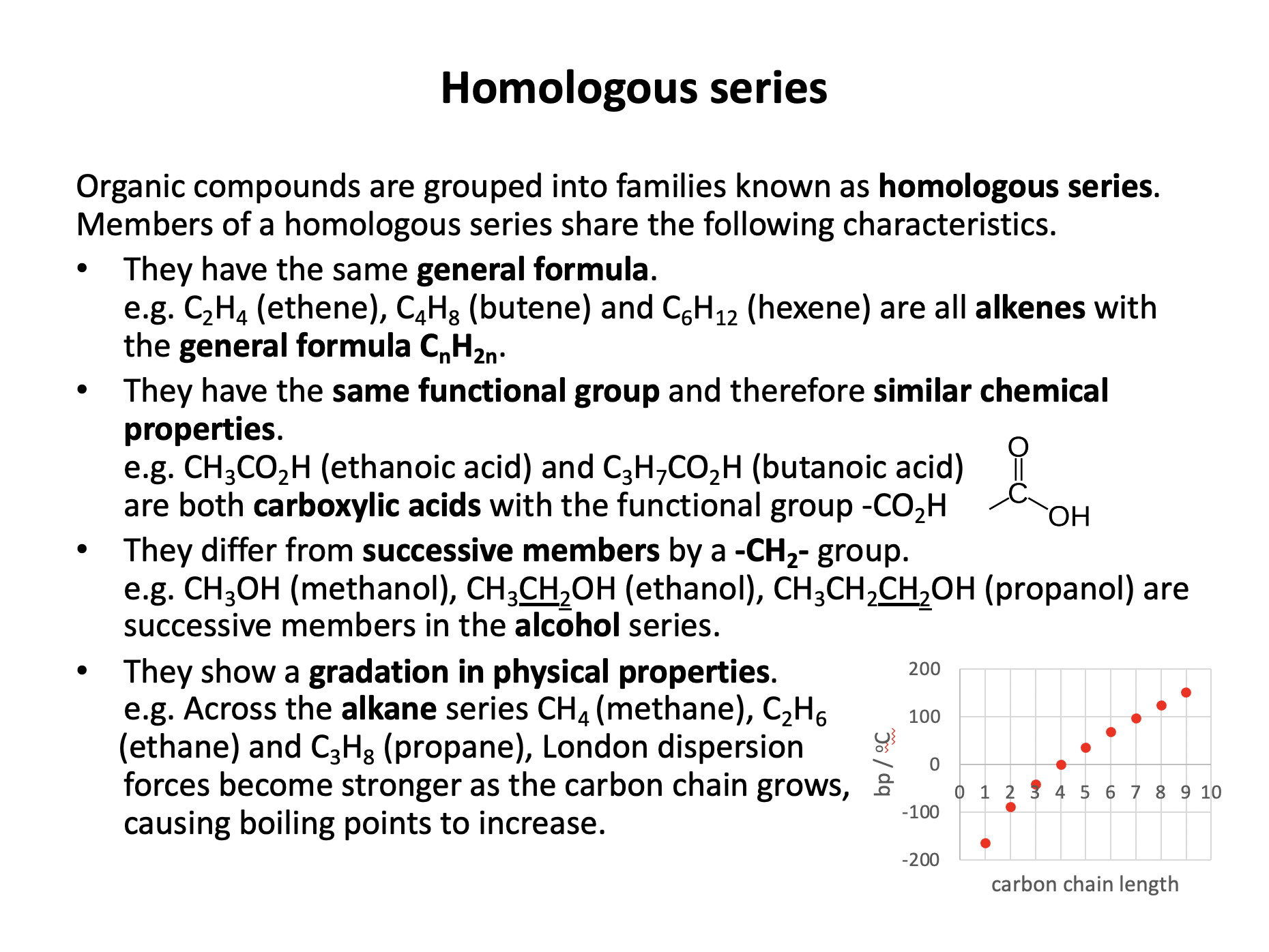 Homologous series of compounds have the same general formula. Their formulae differ in successive sequence by CH2. They have the same functional group and similar chemical properties. They show a gradation in physical properties.