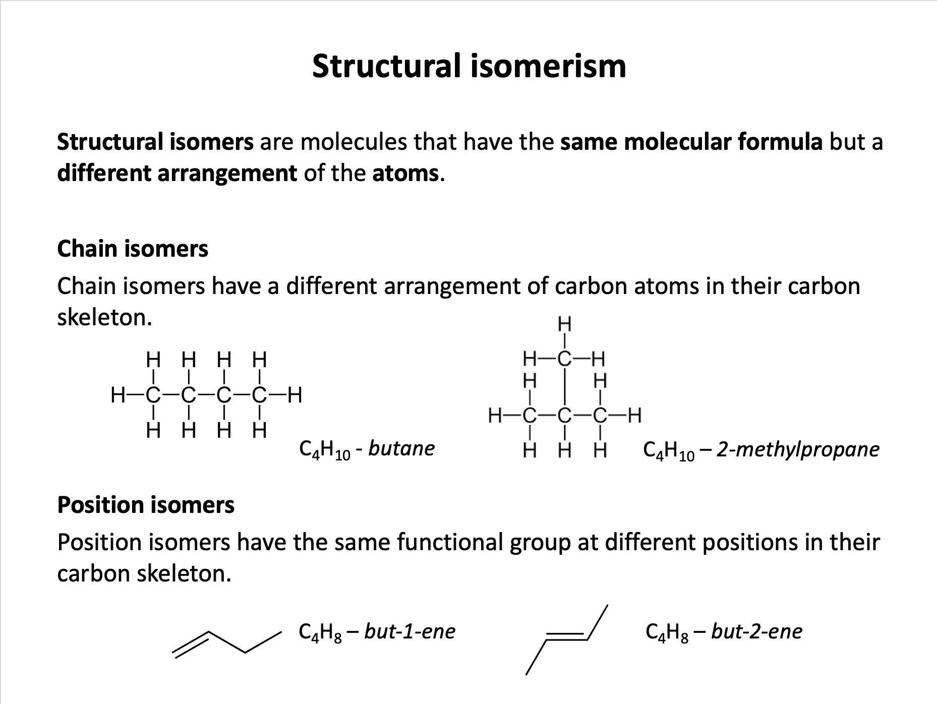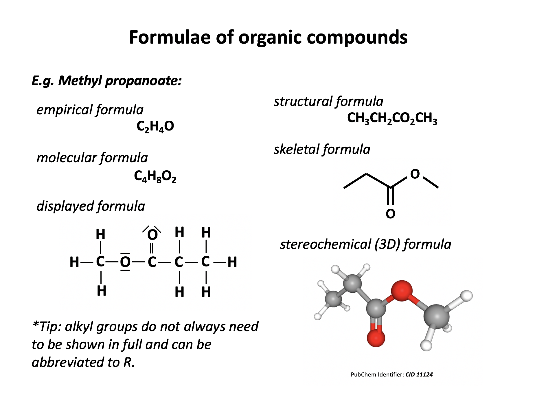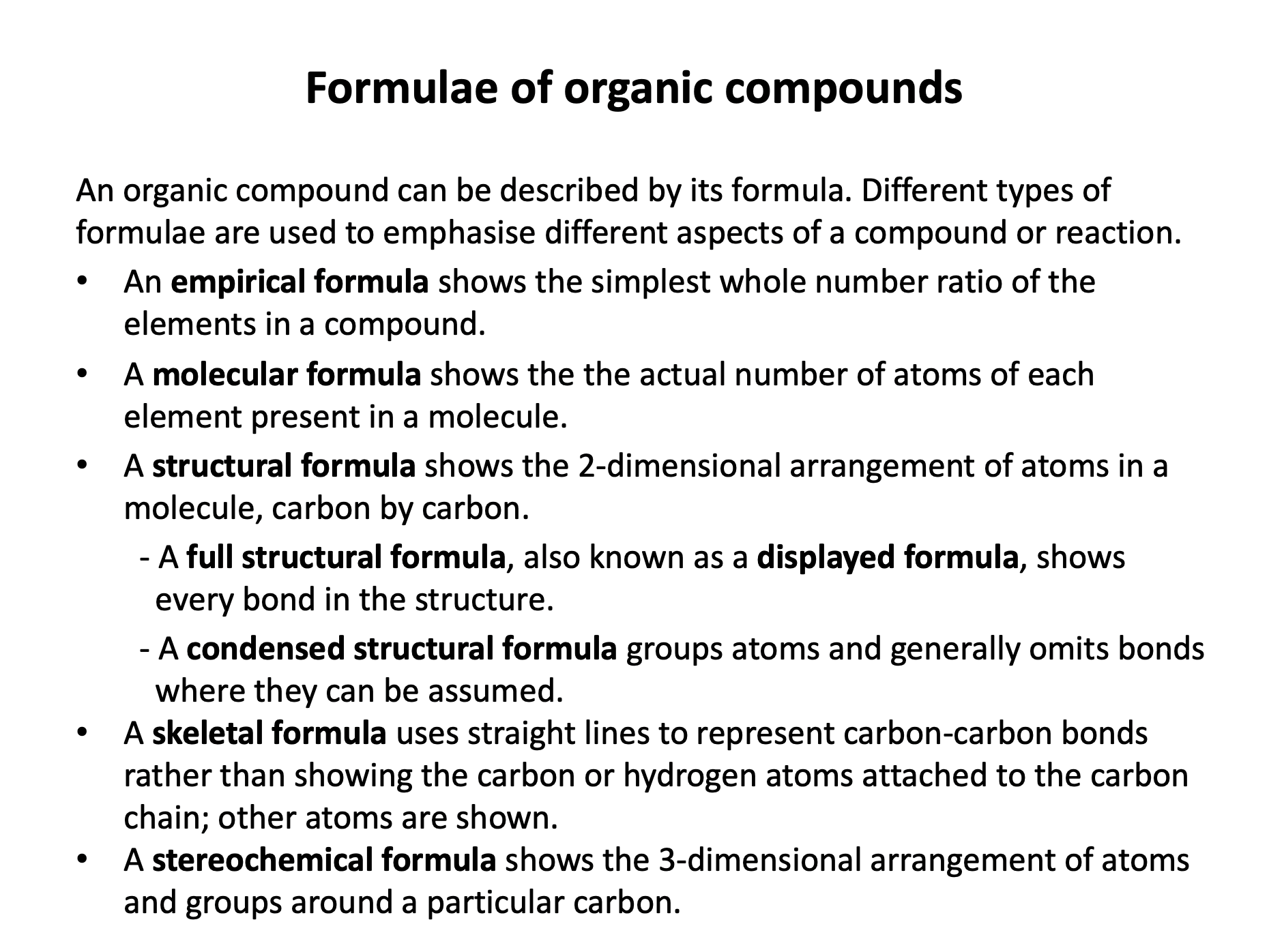 homologous series*, full structural (displayed) formula, structural formula, skeletal formula, stereochemical formula, structural isomers*, chain isomers, position isomers, 1o molecule, 2o molecule, 3o molecule