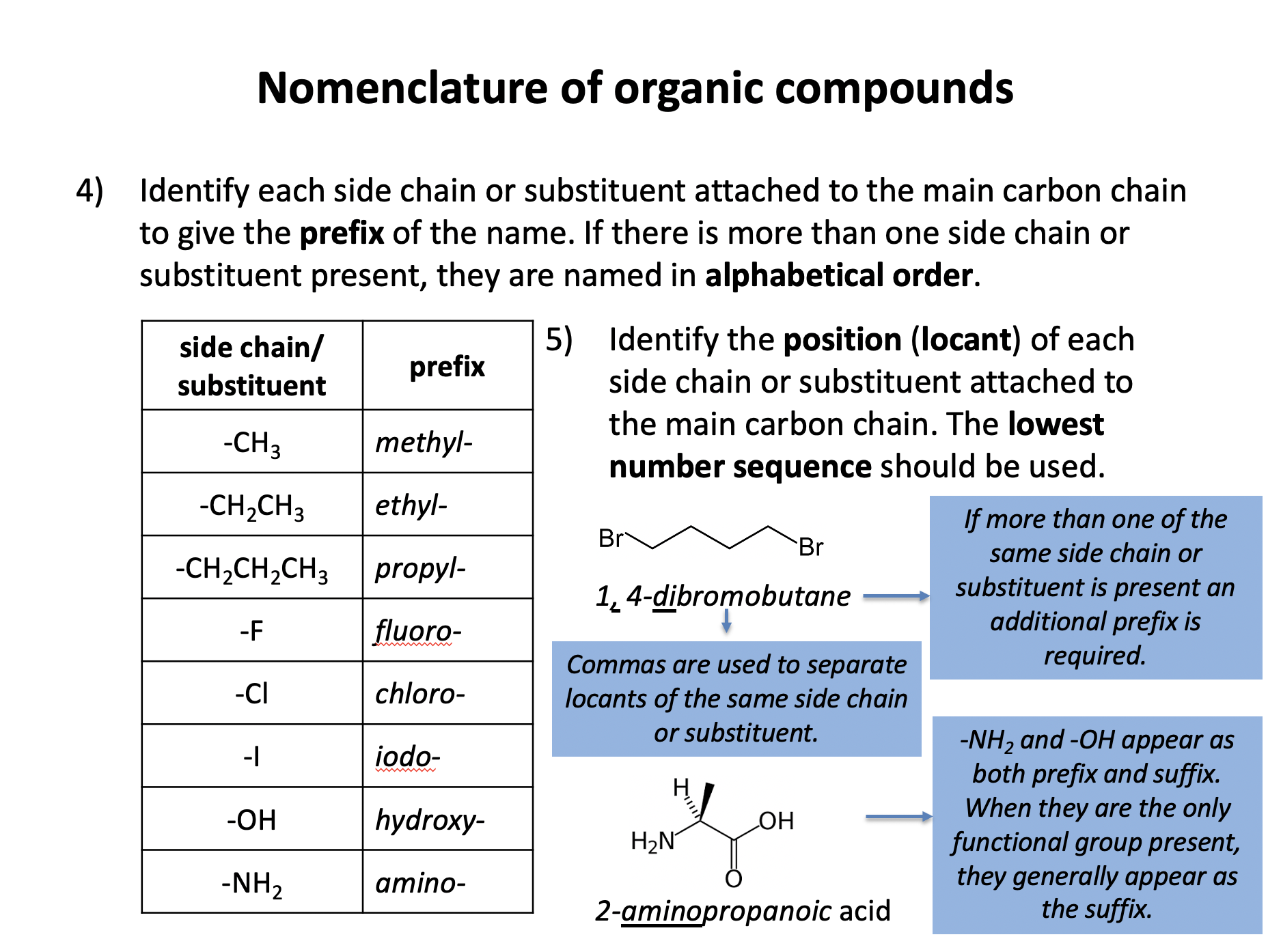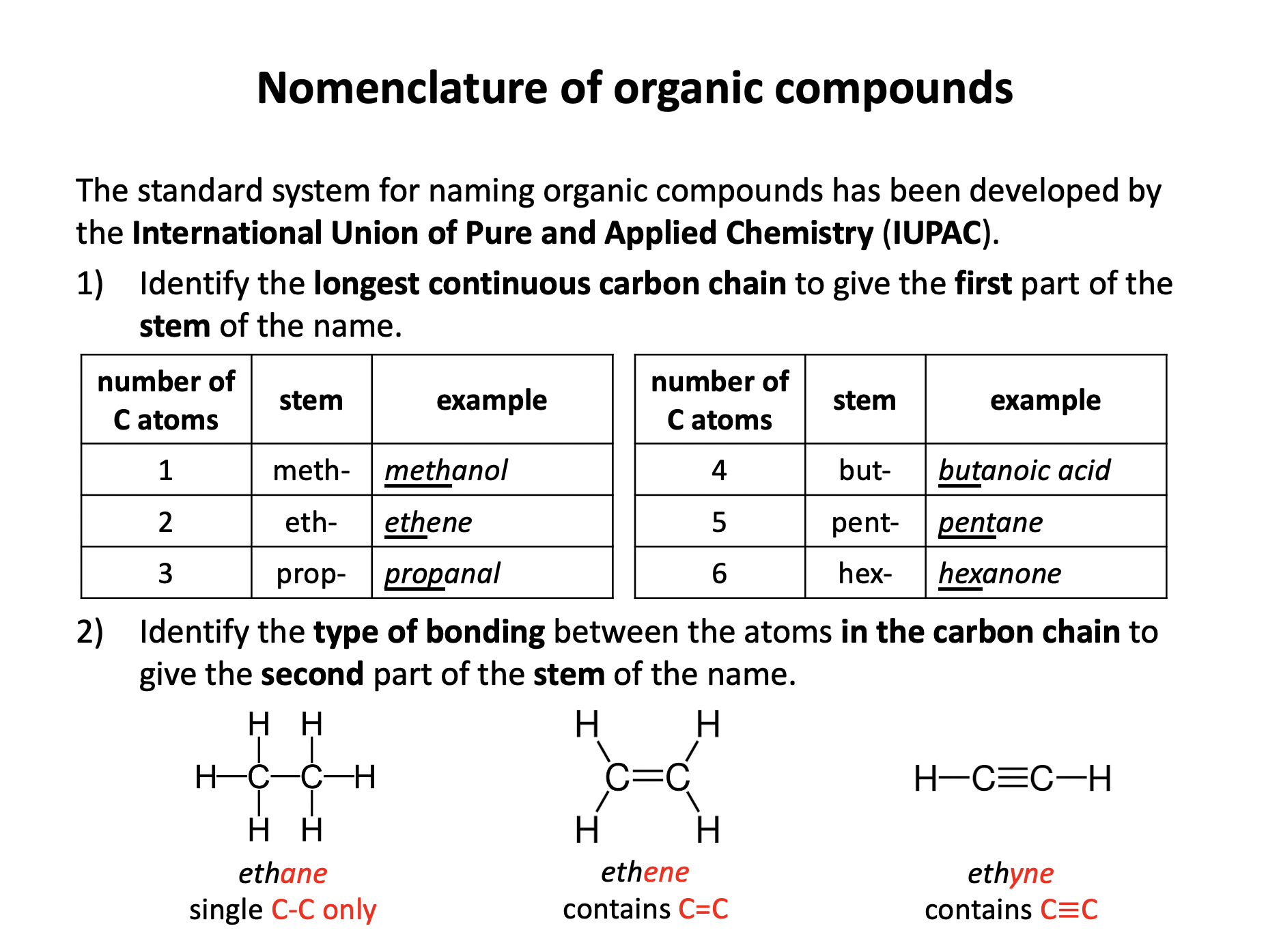 Organic chemistry is the branch of chemistry dedicated to the study of carbon-based compounds. This section looks at their nomenclature and how they are classified. Naming and writing formulae of organic compounds are fundamental skills that require attention to detail. Use the revision cards to familiarise yourself with the IUPAC rules of organic nomenclature and then use the practice questions to apply them. Benzene is an an aromatic unsaturated compound but it does not behave like other unsaturated molecules due to the presence of a delocalised pi-electron cloud. Use revision card 10 to ensure that you understand how this model of benzene is supported by evidence.