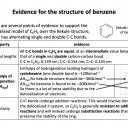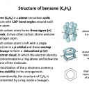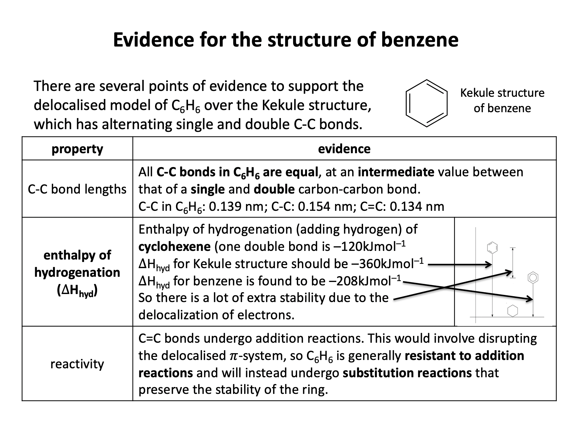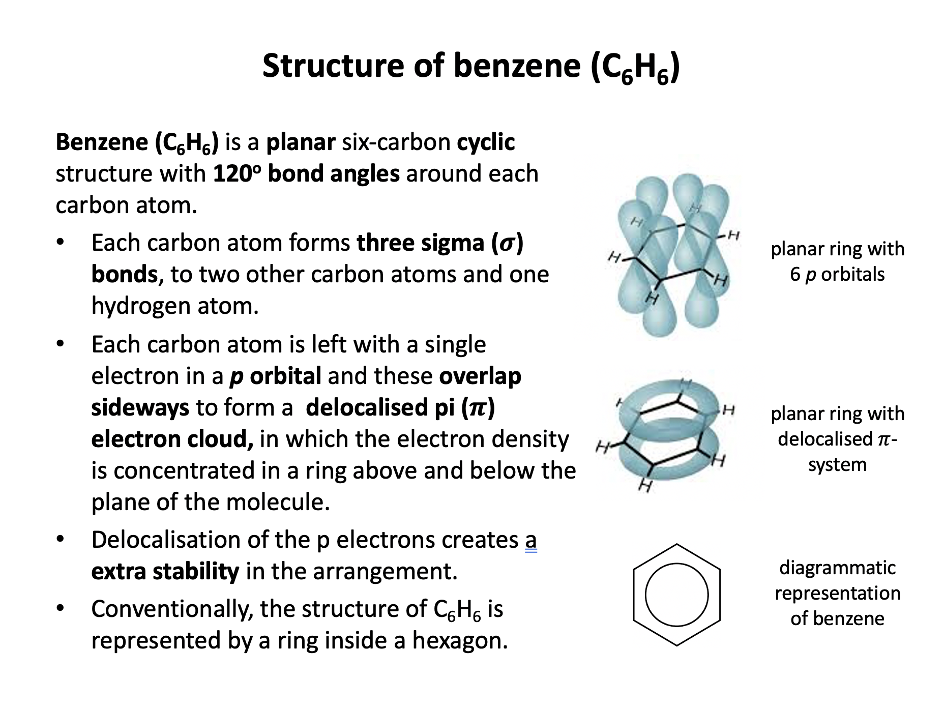 Benzene is a planar molecule, with the six carbon atoms forming the shape of a regular hexagon. The carbon-carbon bonds are all the same length, but that is an intermediate length between a double and single bond. Although we sometimes draw it with three double (C=C) and three single (C−C) bonds, it does not possess double bonds because benzene is a delocalised structure. The delocalised structure gives benzene extra stability.